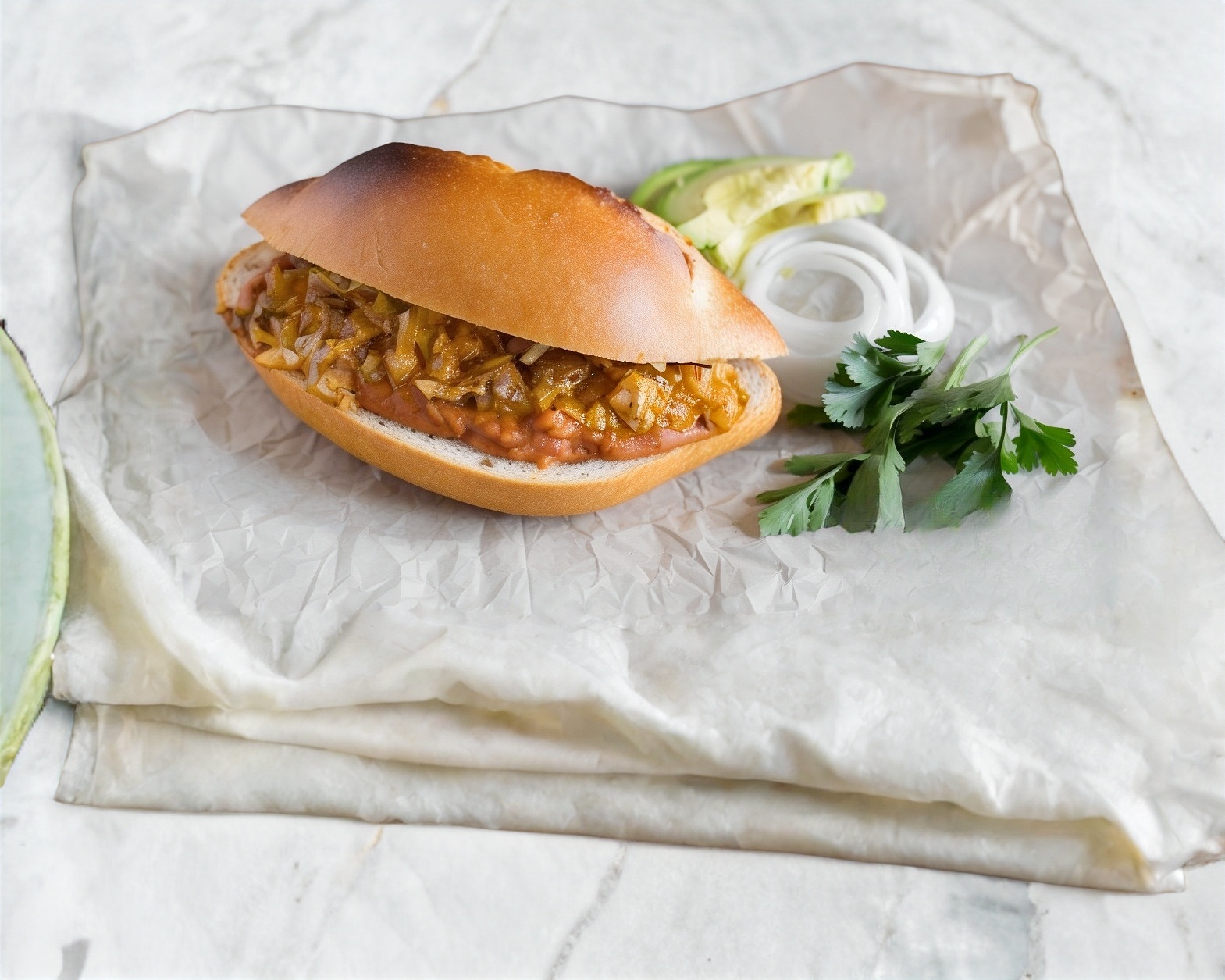 Salchicha fut, jamón y quesillo pasta de frijol mahonesa aguacate tomate y chiles en rajas.