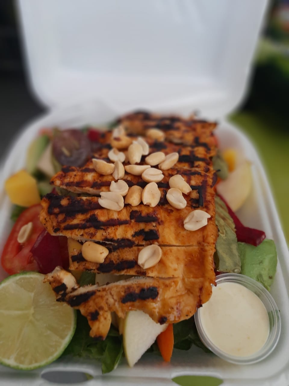Pechuga asada a la BBQ, arroz, tortillas, salsa, ensalada, pasta de frijol,.