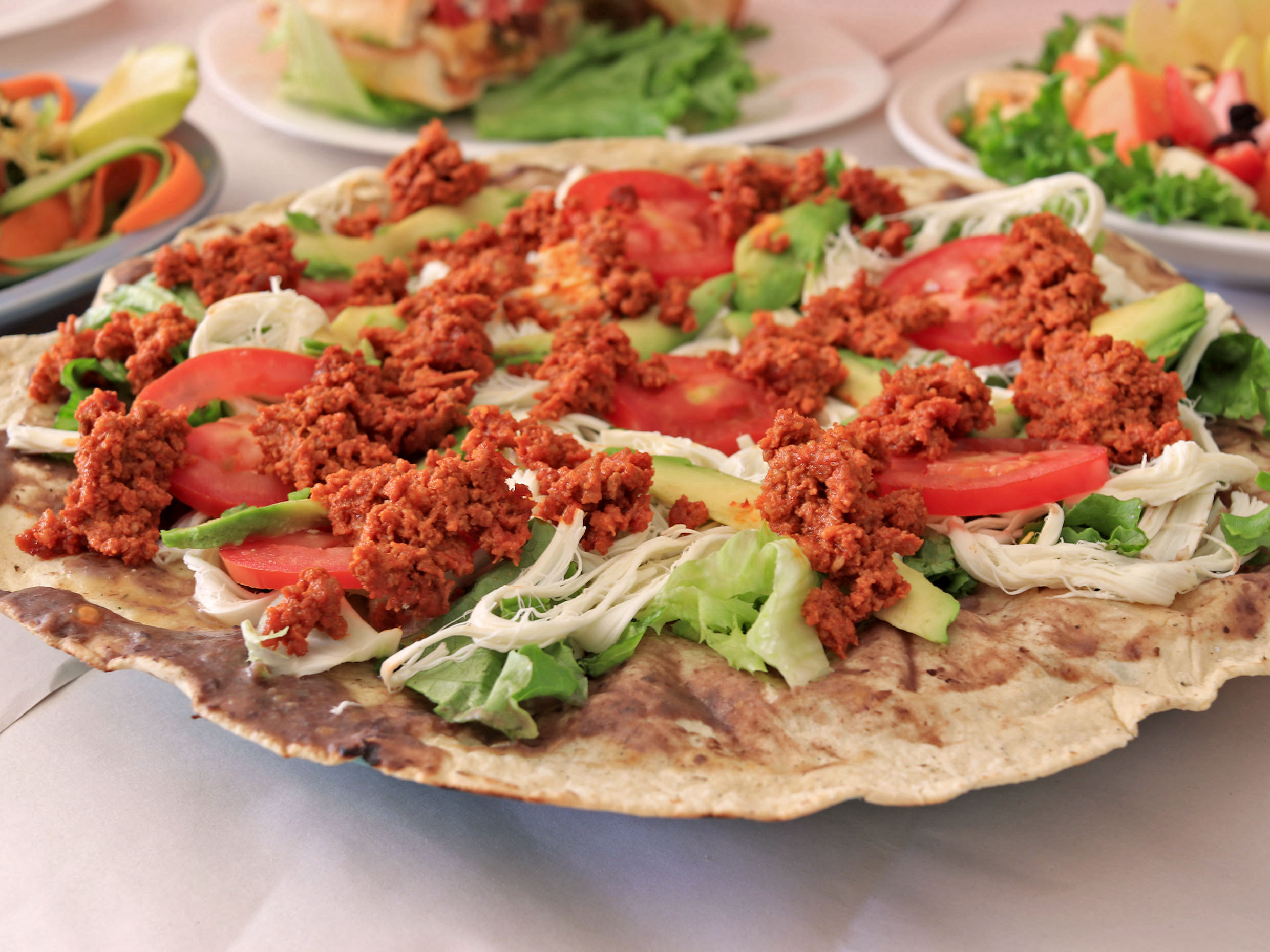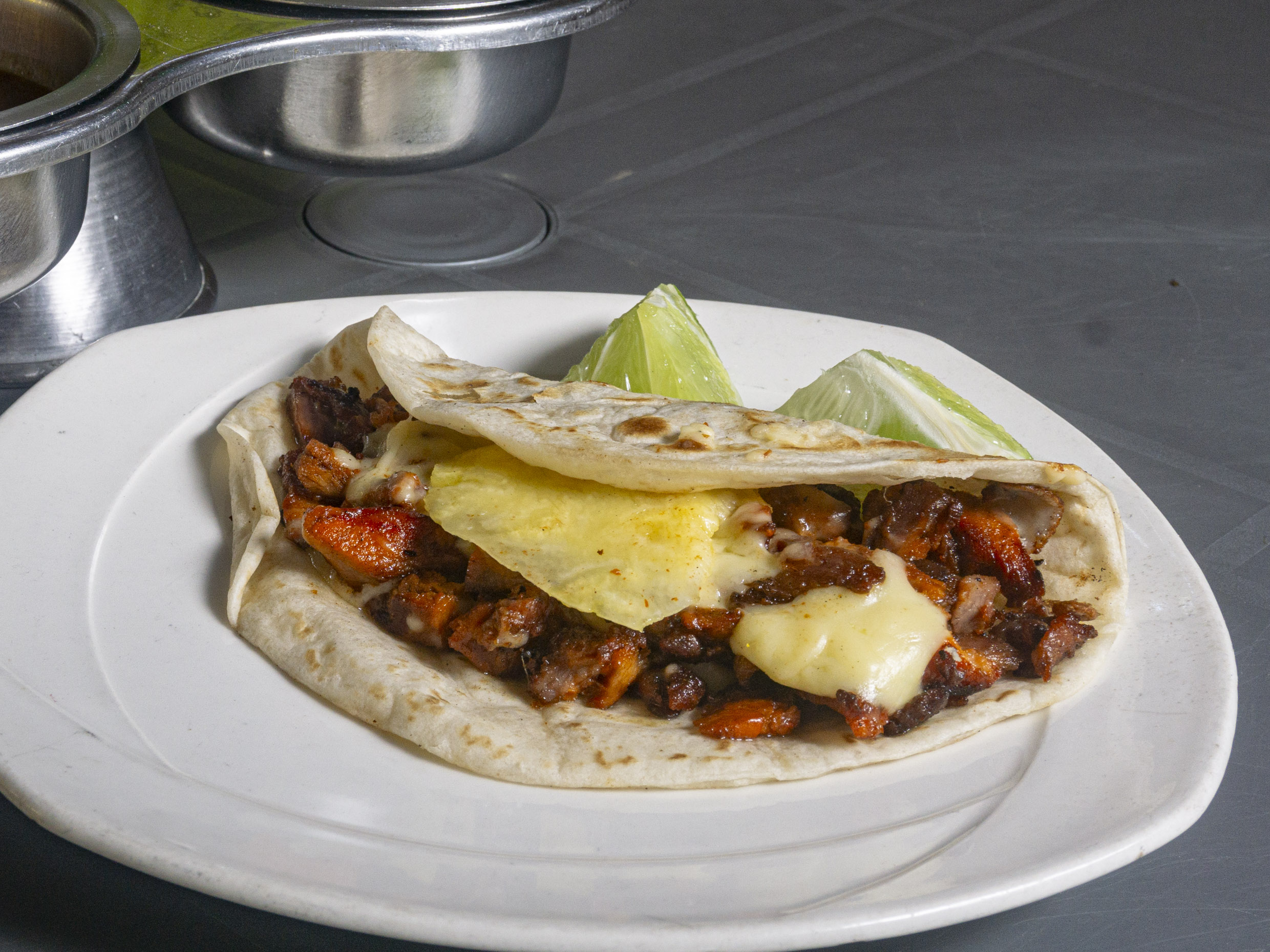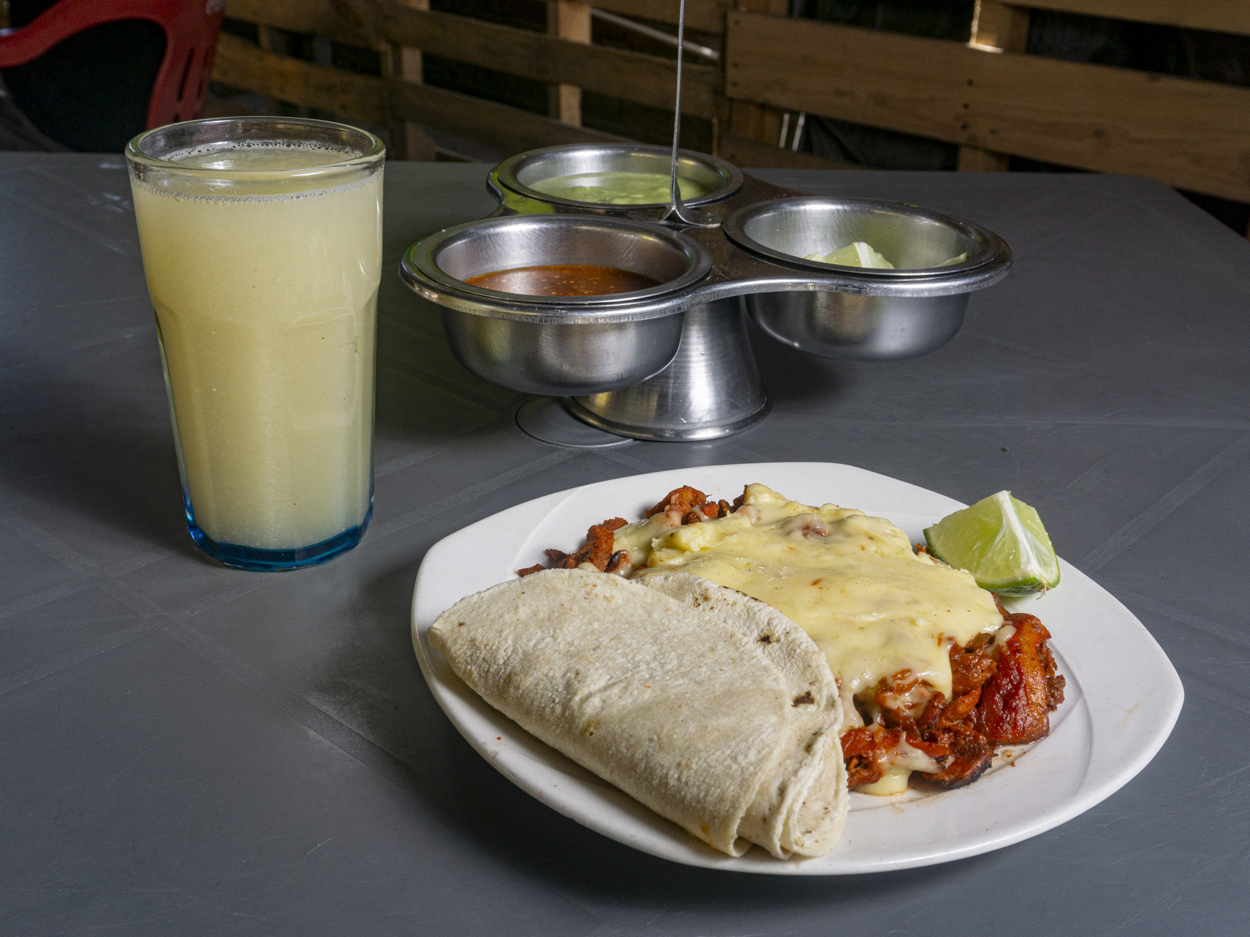 Carne al pastor, piña, quesillo, pasta de frijol, mayonesa, aguacate, tomate, picante.