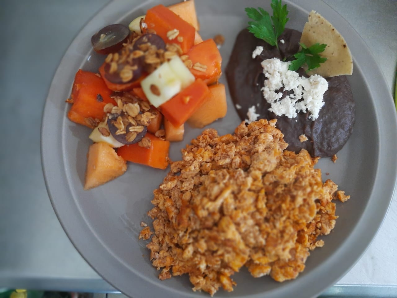 Huevos revueltos con jamón de pavo, pasta de frijol, fruta picada, tortillas de mano recién bajaditas del comal.