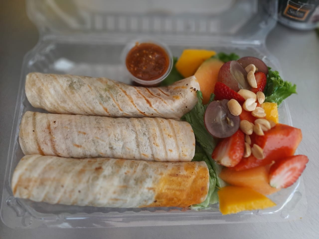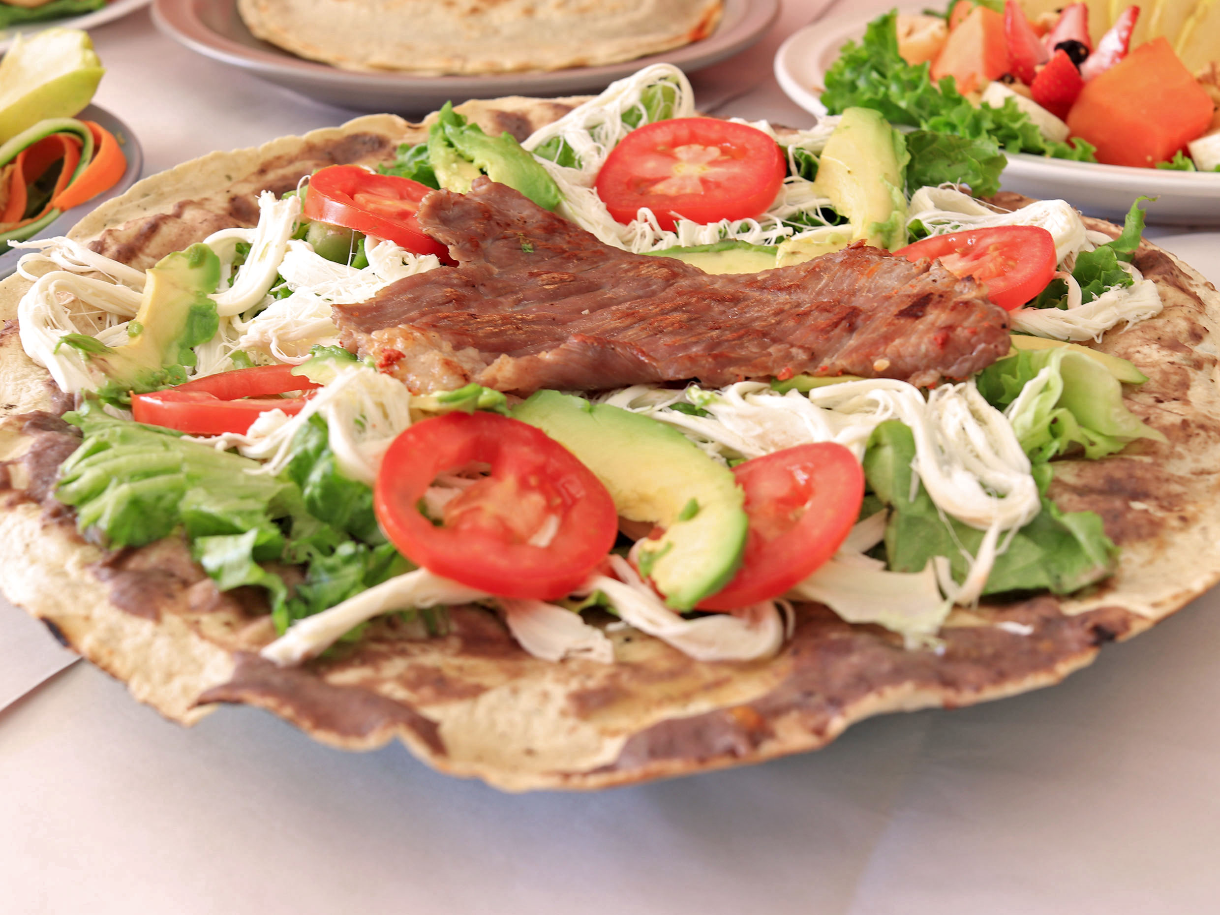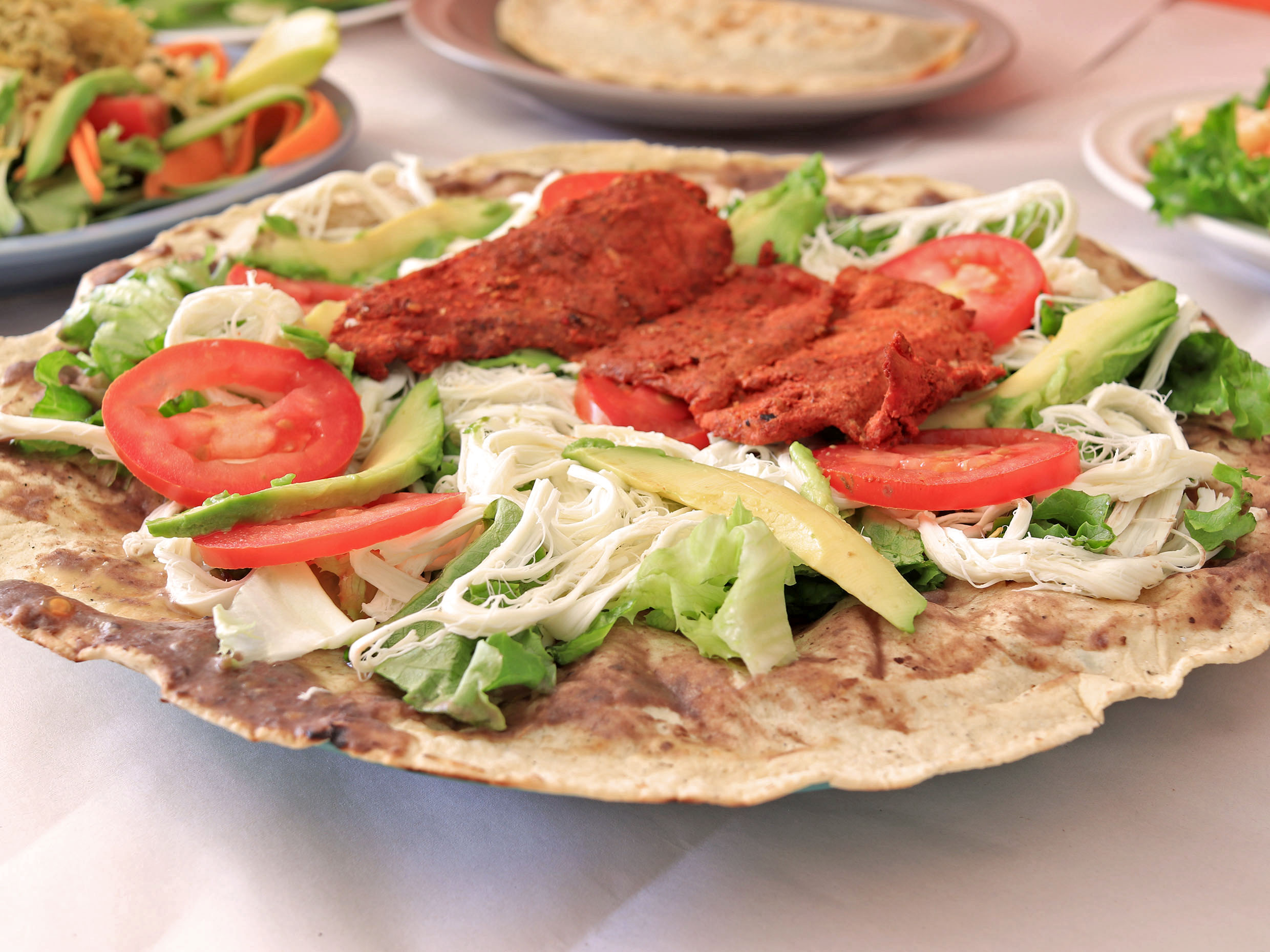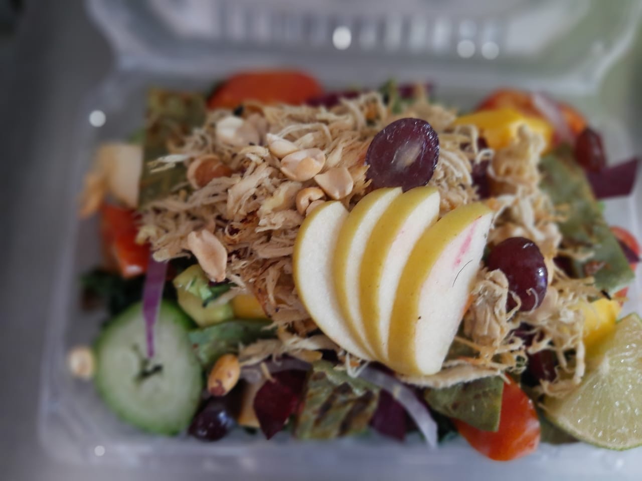 Pollo, pasta de frijol, aguacate, tomate, lechuga, fruta picada.