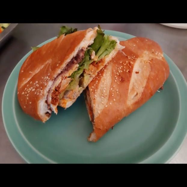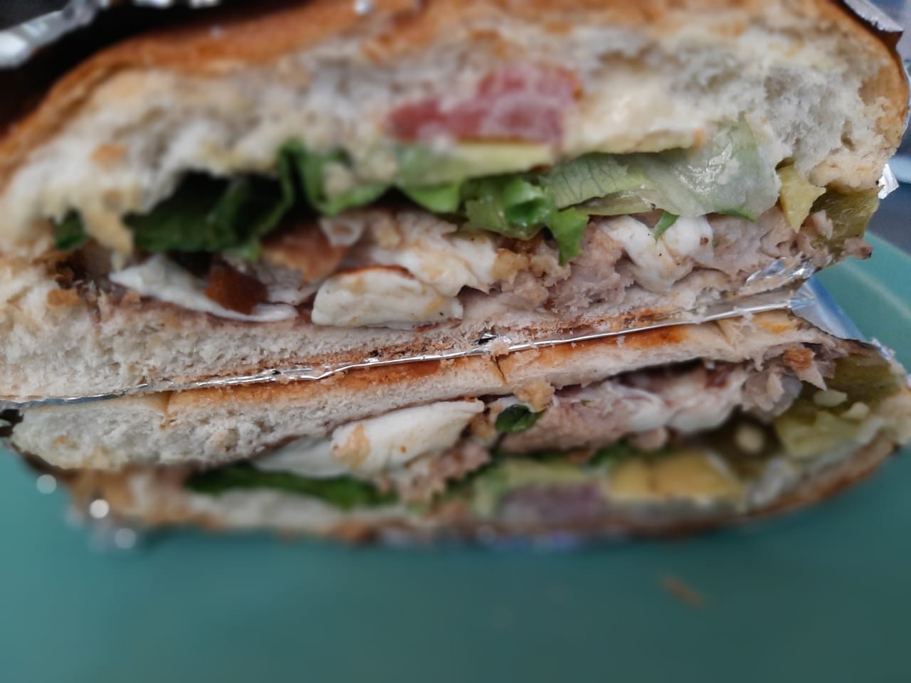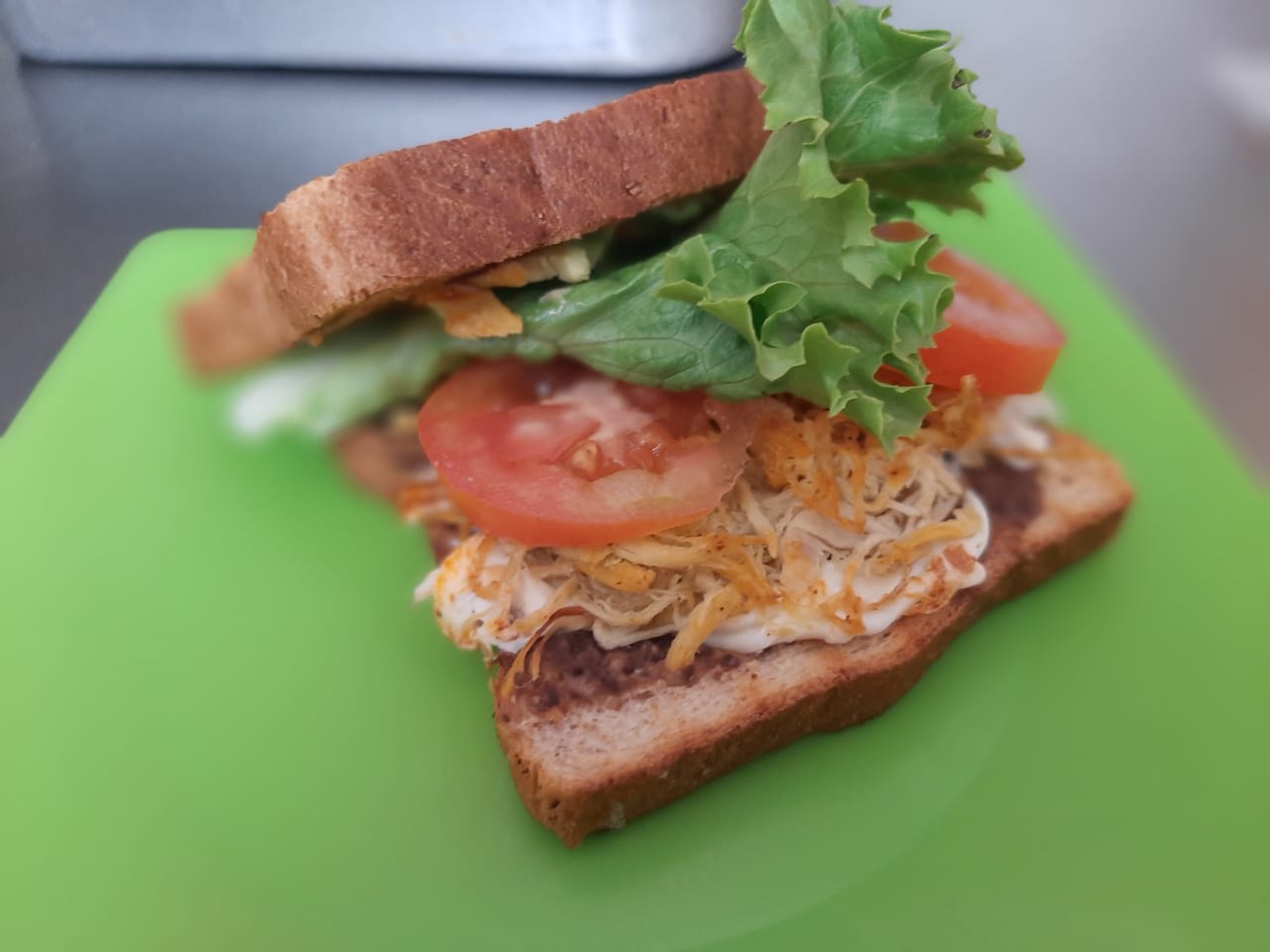 Pan integral, pechuga asada, aguacate tomate, mayonesa, pasta de frijol, lechuga, picante.