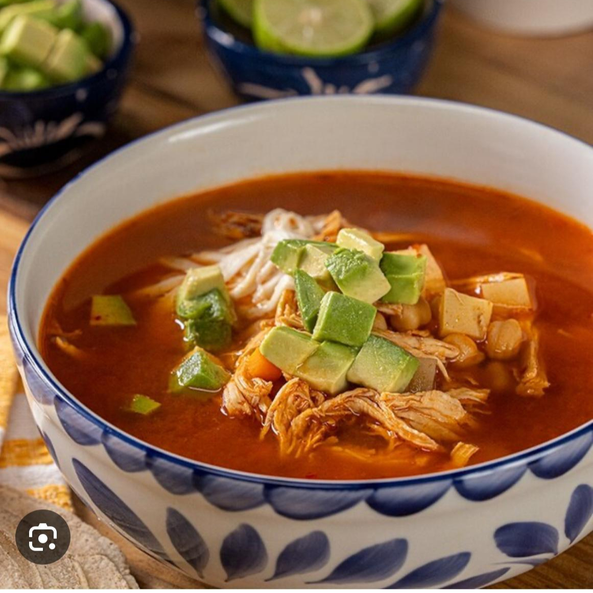 Caldo de pollo con tomate, tortillas fritas de maÃz en tiritas, epazote, queso fresco, crema, aguacate y chicharron