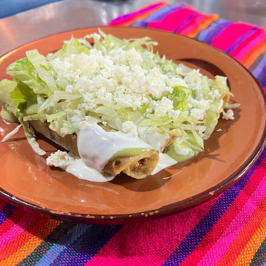 4 Tortillas rellenas de pollo, guacamole, queso, crema, lechuga y salsa verde.