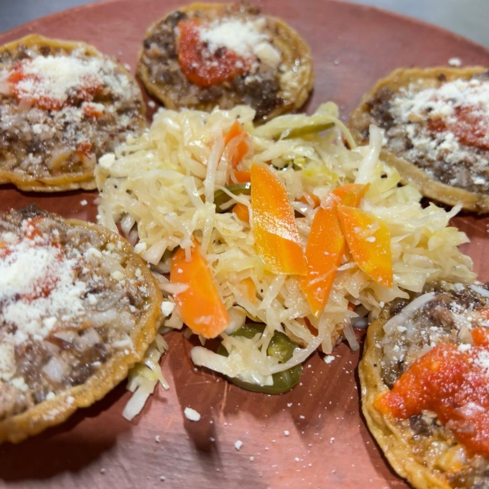 Pequeñas tortillas de maíz, cubiertas con carne de res deshebrada y fritas, con salsa roja picosita, queso seco y encurtido de col y zanahoria.