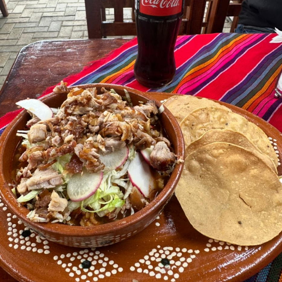 Caldo de chile guajillo con panza de res y garbanzos acompañado de tortillas