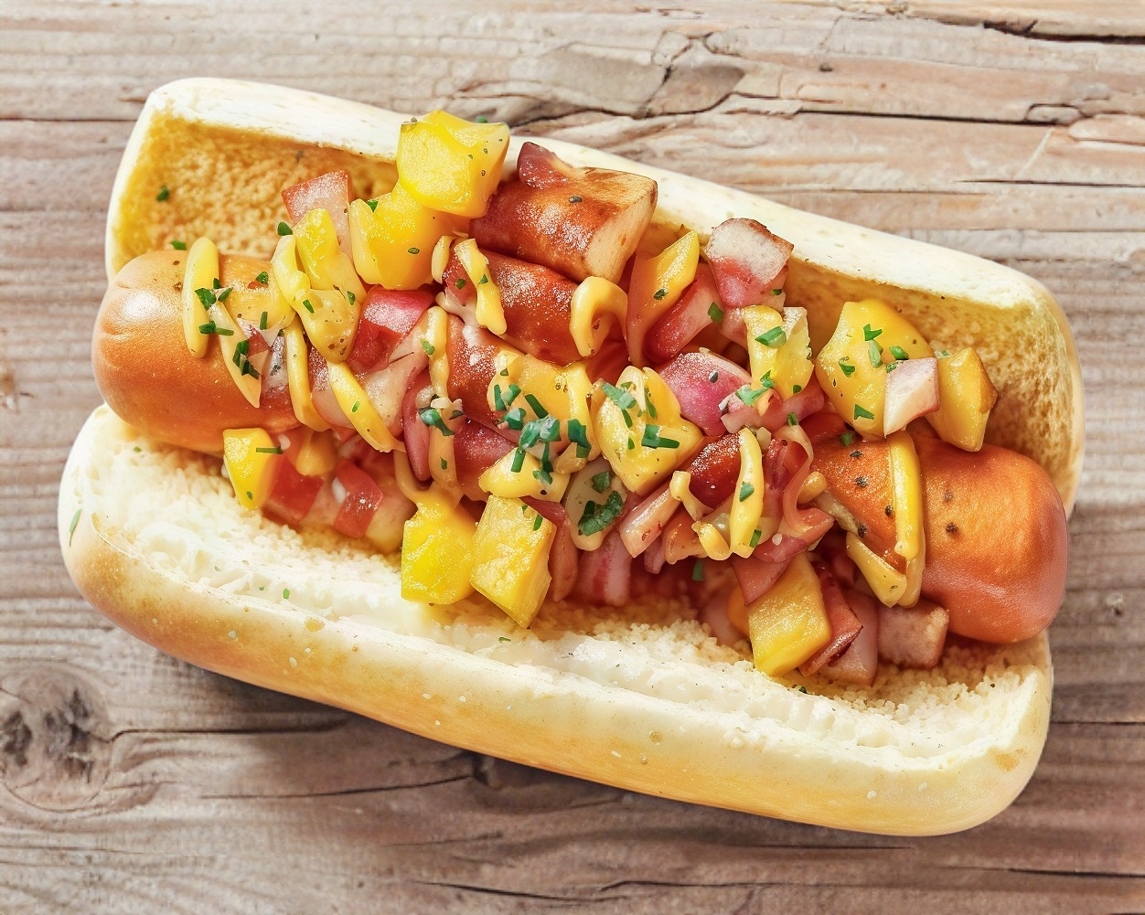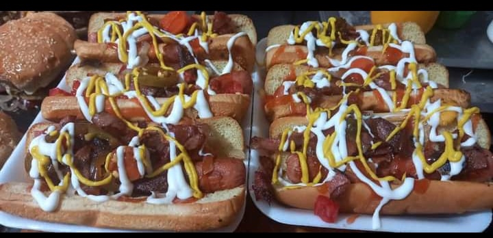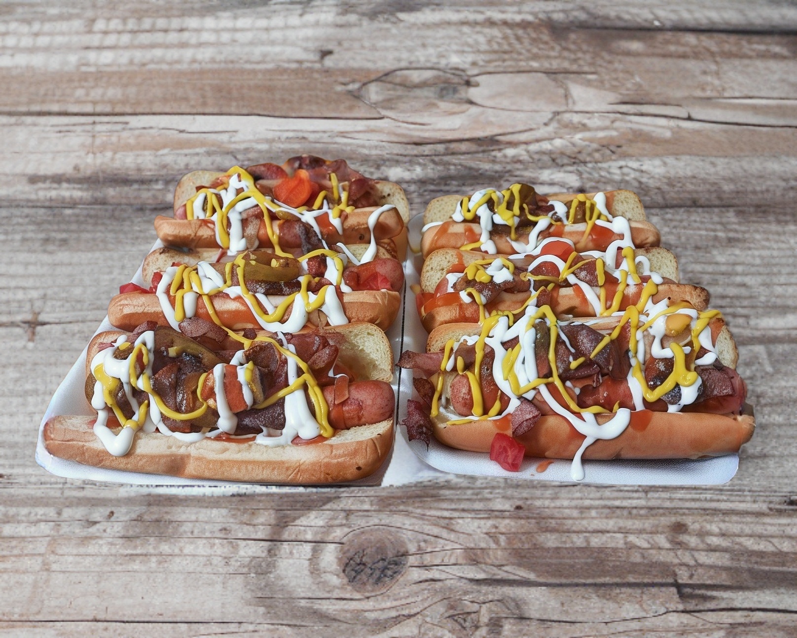 Salchicha de pavo, tocino, tomate cebolla frita.aderezos y picante