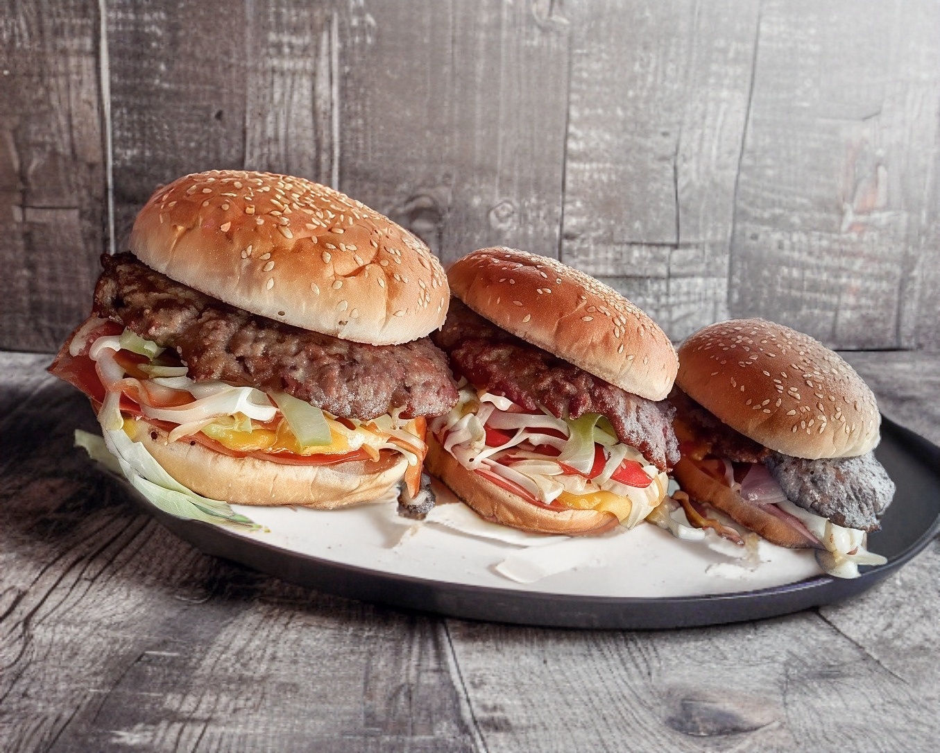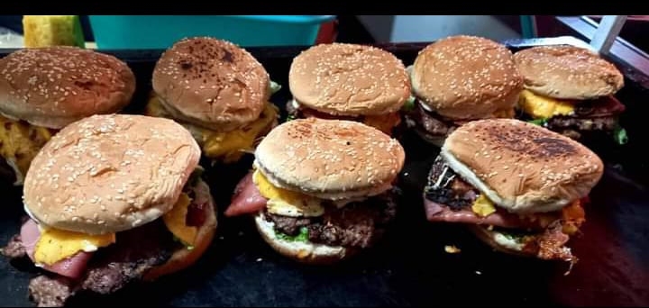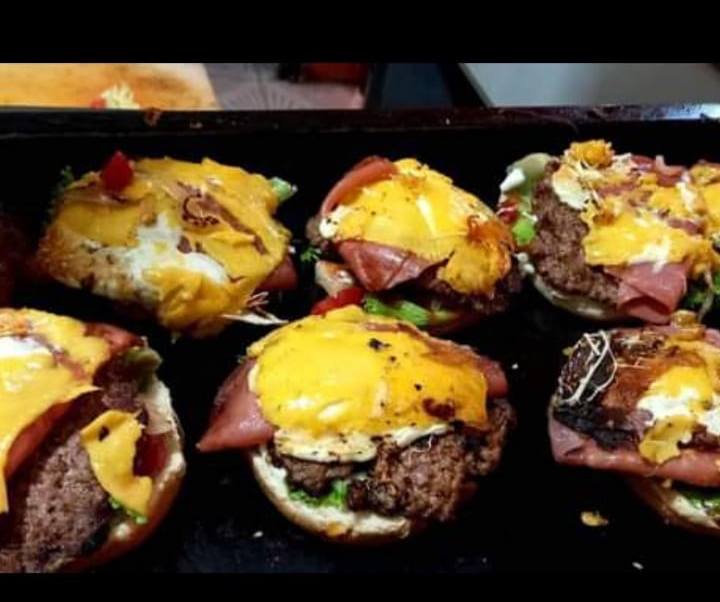 Carne, jamón, queso amarillo, tomate, lechuga, cebolla frita. Aderezos y picante