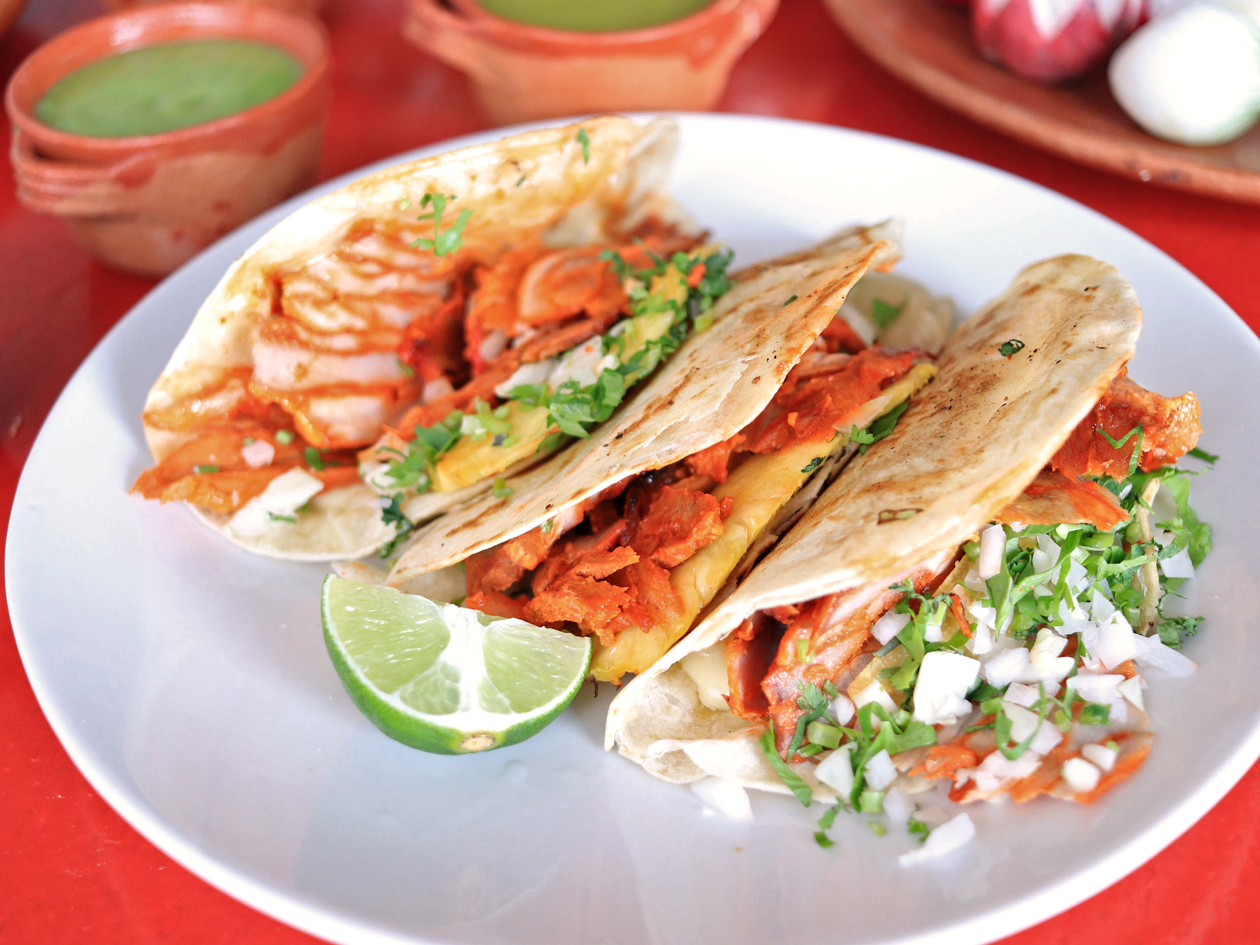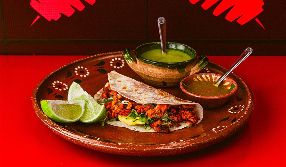 TORTILLA DE HARINA DE TRIGO CON EXQUISITA CARNE PASTOR CERDO MIXTACOS®️♨️💯, PIÑA, CILANTRO,CEBOLLA,APARTE, INCLUYE LIMÓN, SALSA VERDE Y GUACAMOLE.