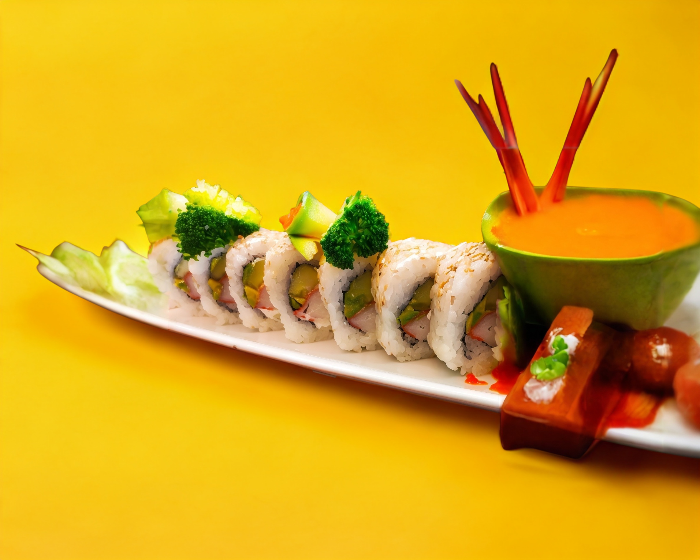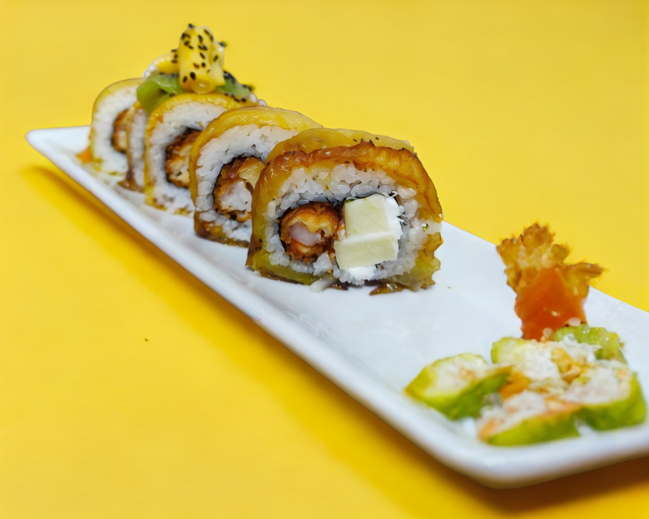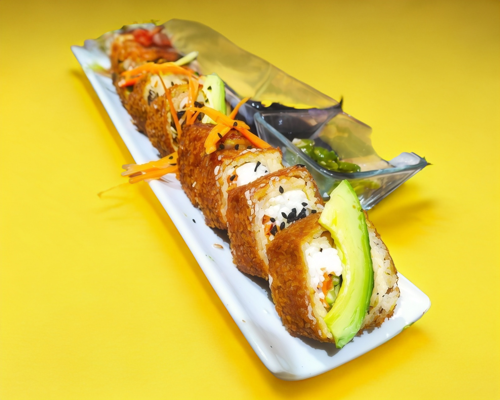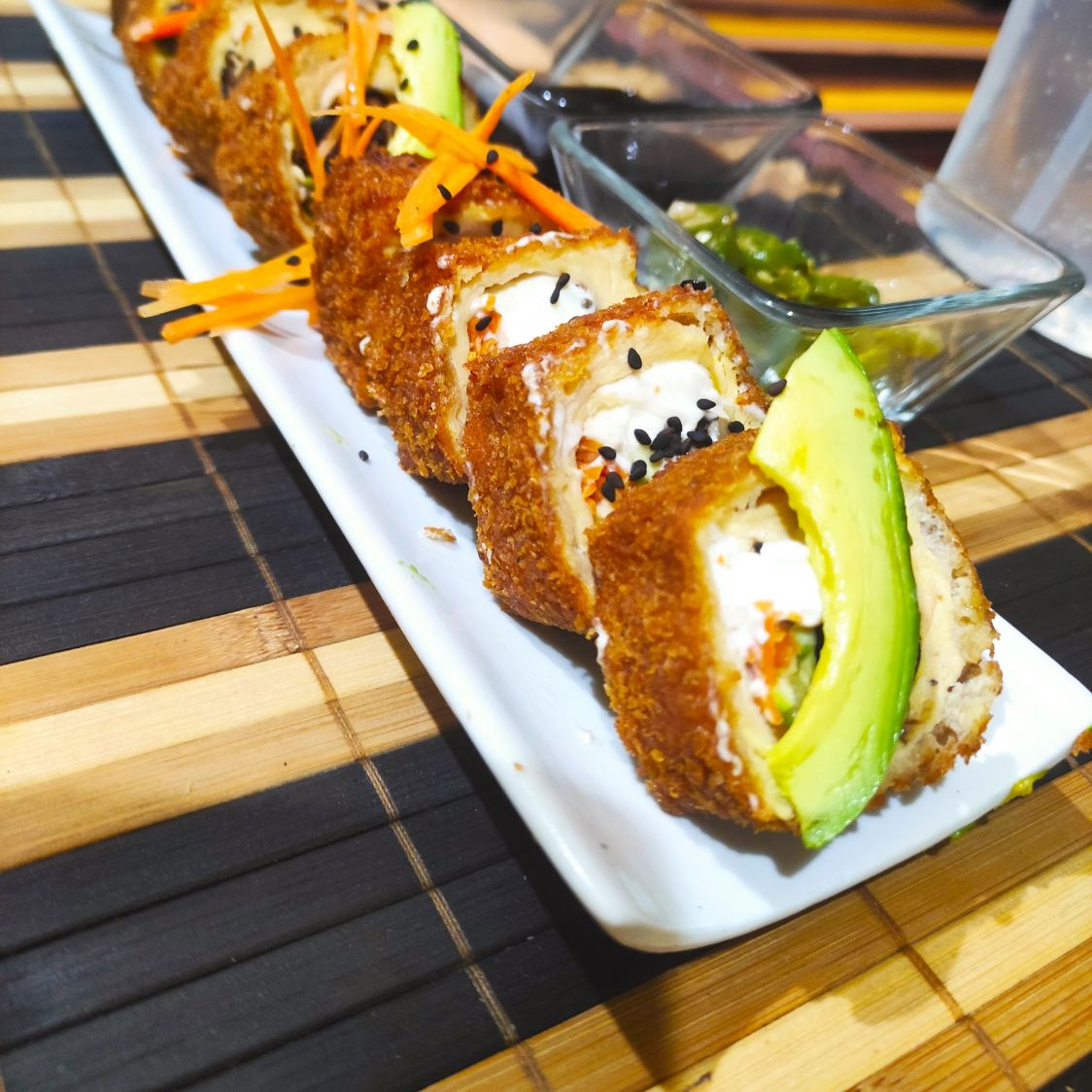 Por fuera verduras al tempura, ajonjolí y salsa de anguila, por dentro queso crema, aguacate y camarón empanizado.