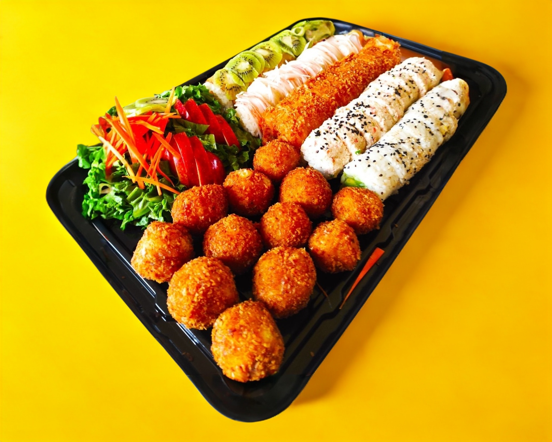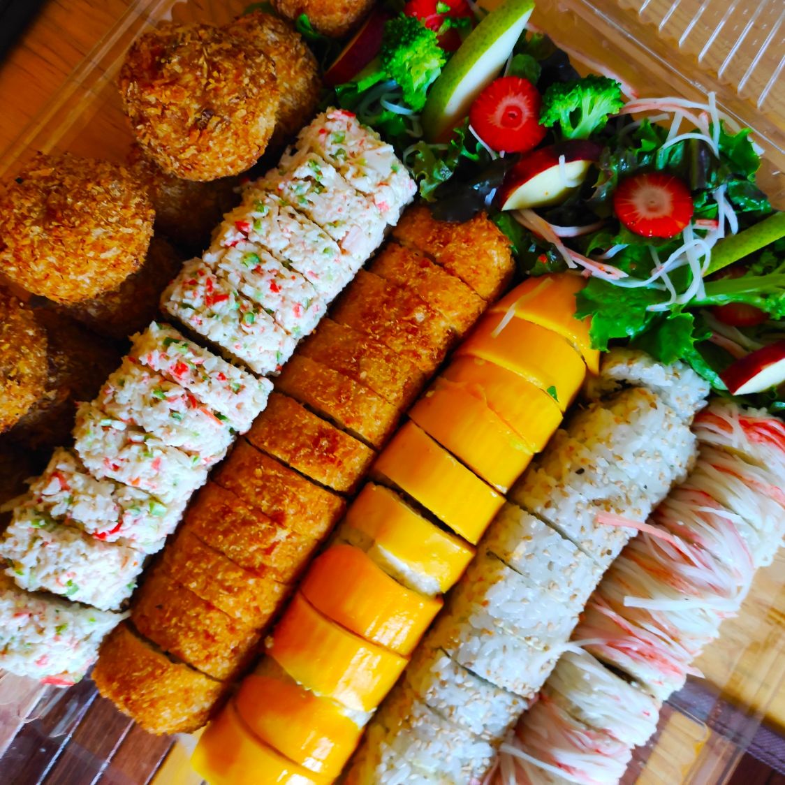 Por fuera empanizado, por dentro pepino, aguacate, salmón y surimi.
