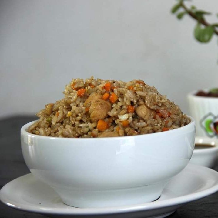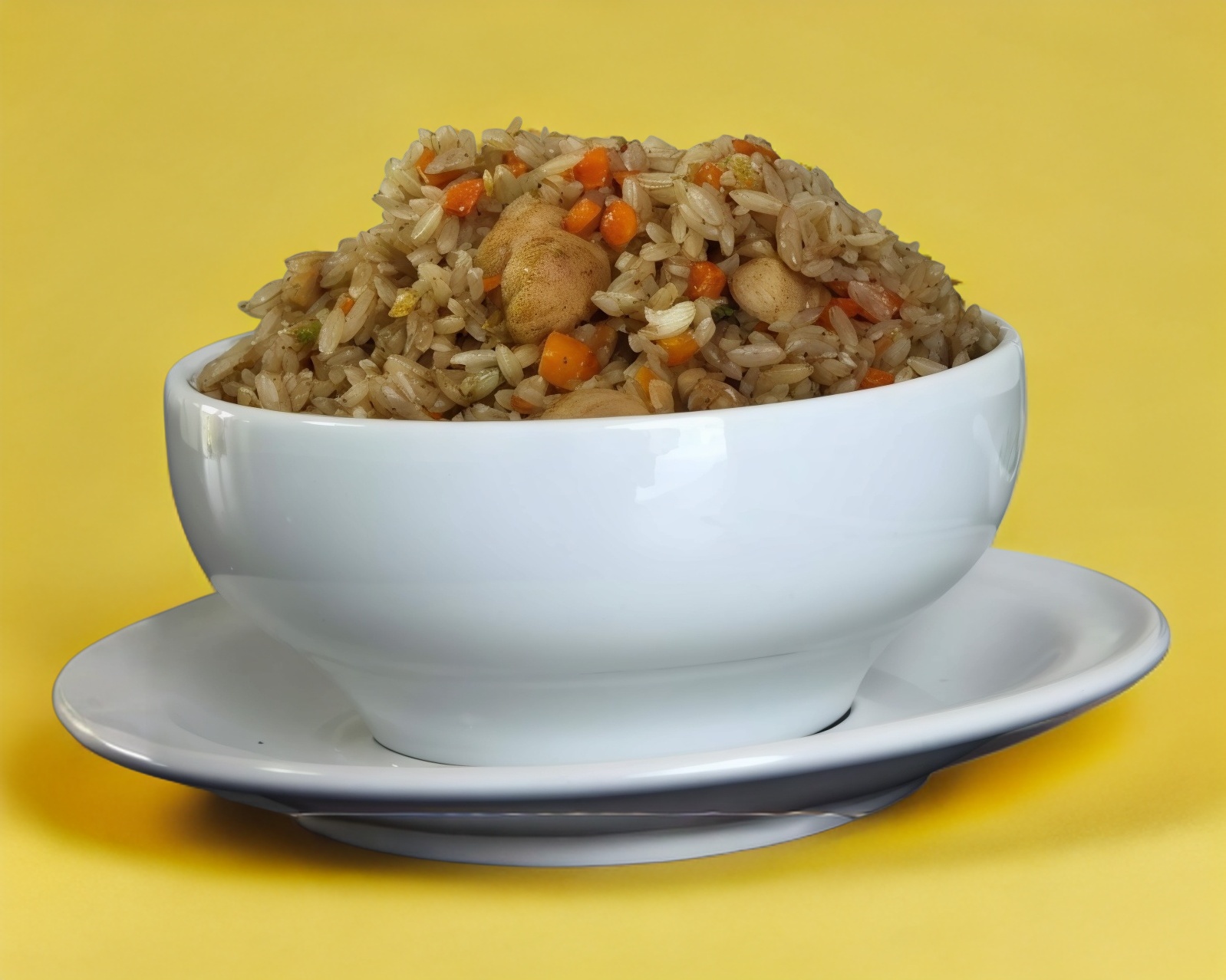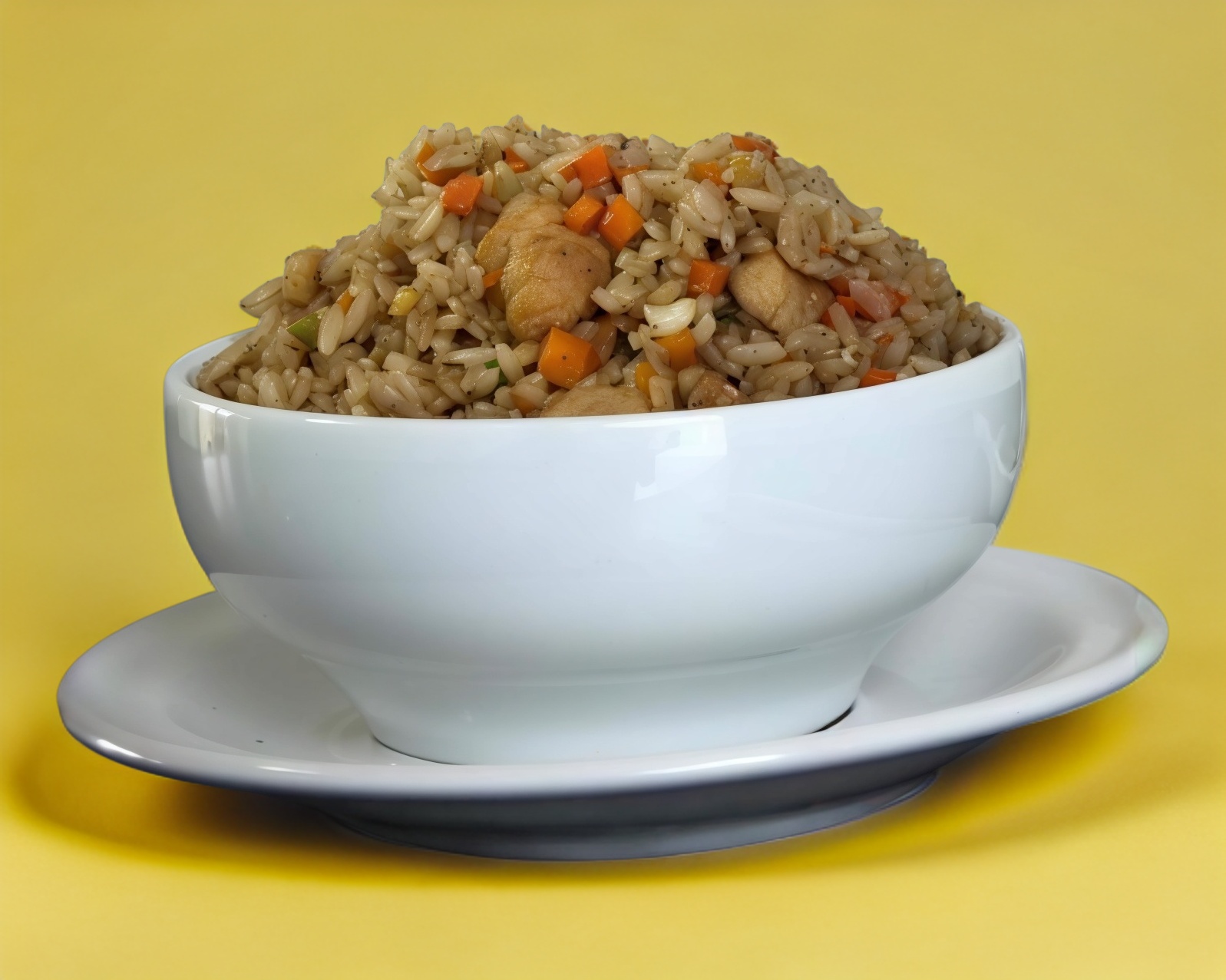 Proteína pollo, camarón y arrachera, Ingredientes verduras zanahoria, calabacita, cebolla y arroz.