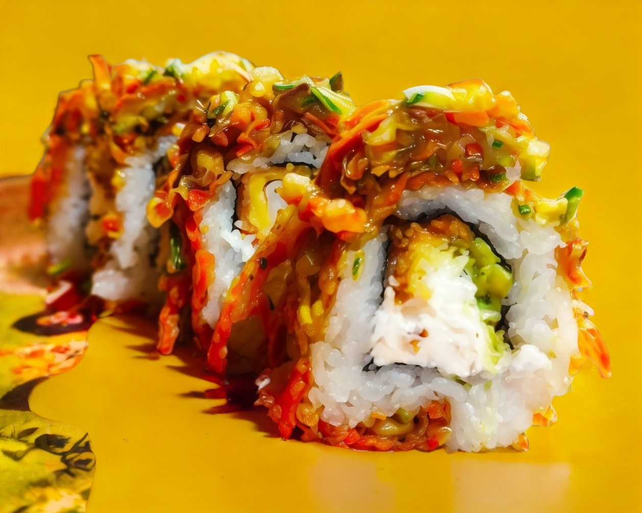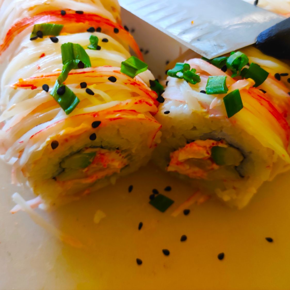 Por fuera cangrejo, ajonjolí y salsa de anguila, por dentro queso crema, camarón empanizado y aguacate.