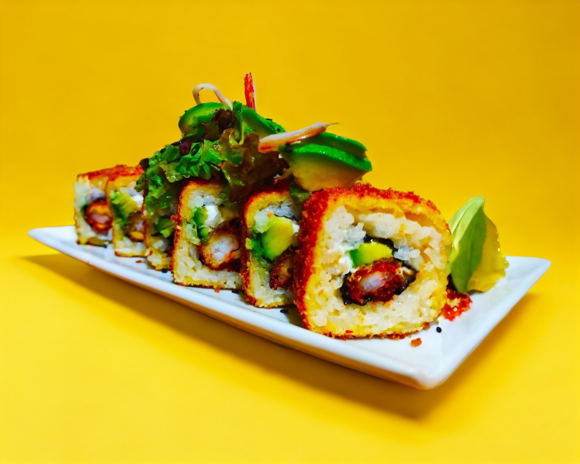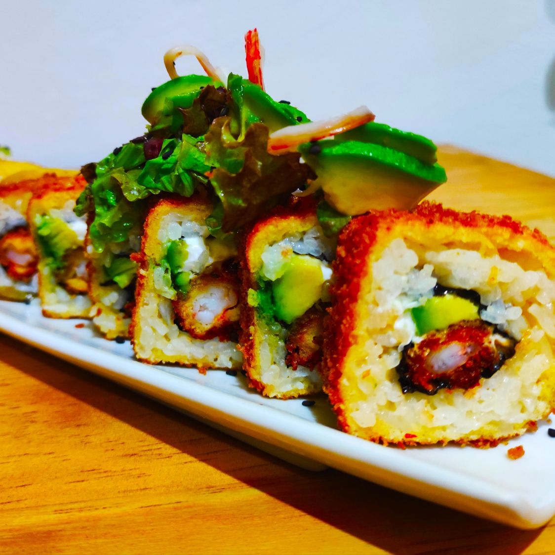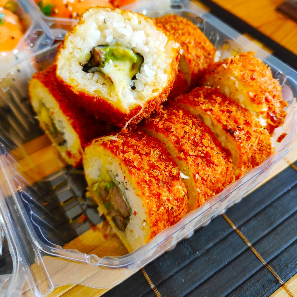 Por fuera empanizado, por dentro surimi, queso crema, pepino, aguacate y salsa de anguila. (Tamaño personal)