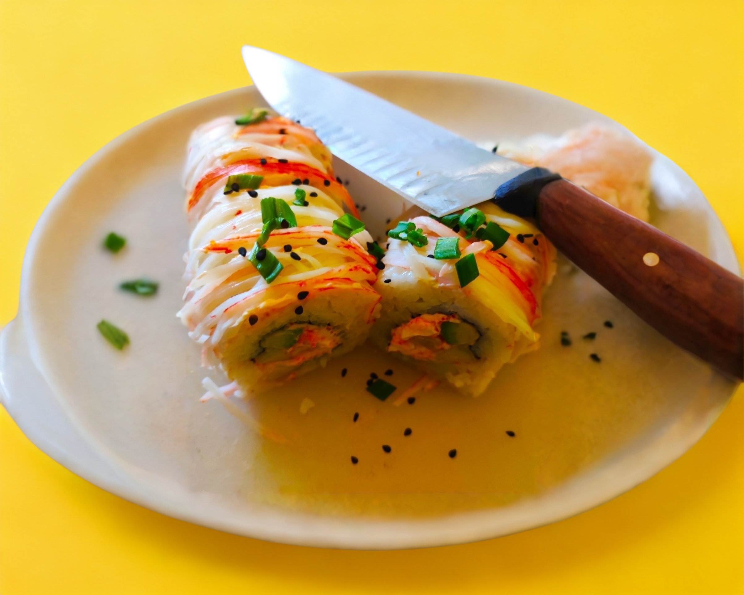 Por fuera queso crema, por dentro aguacate, surimi y pepino.