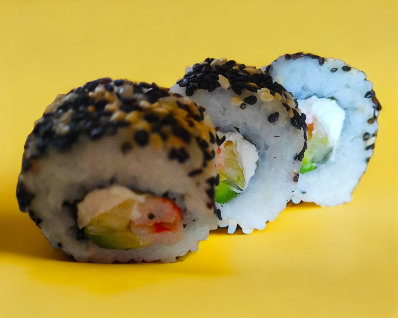 Por fuera ajonjolí blanco y queso crema, por dentro queso crema, camarón, aguacate y pepino.