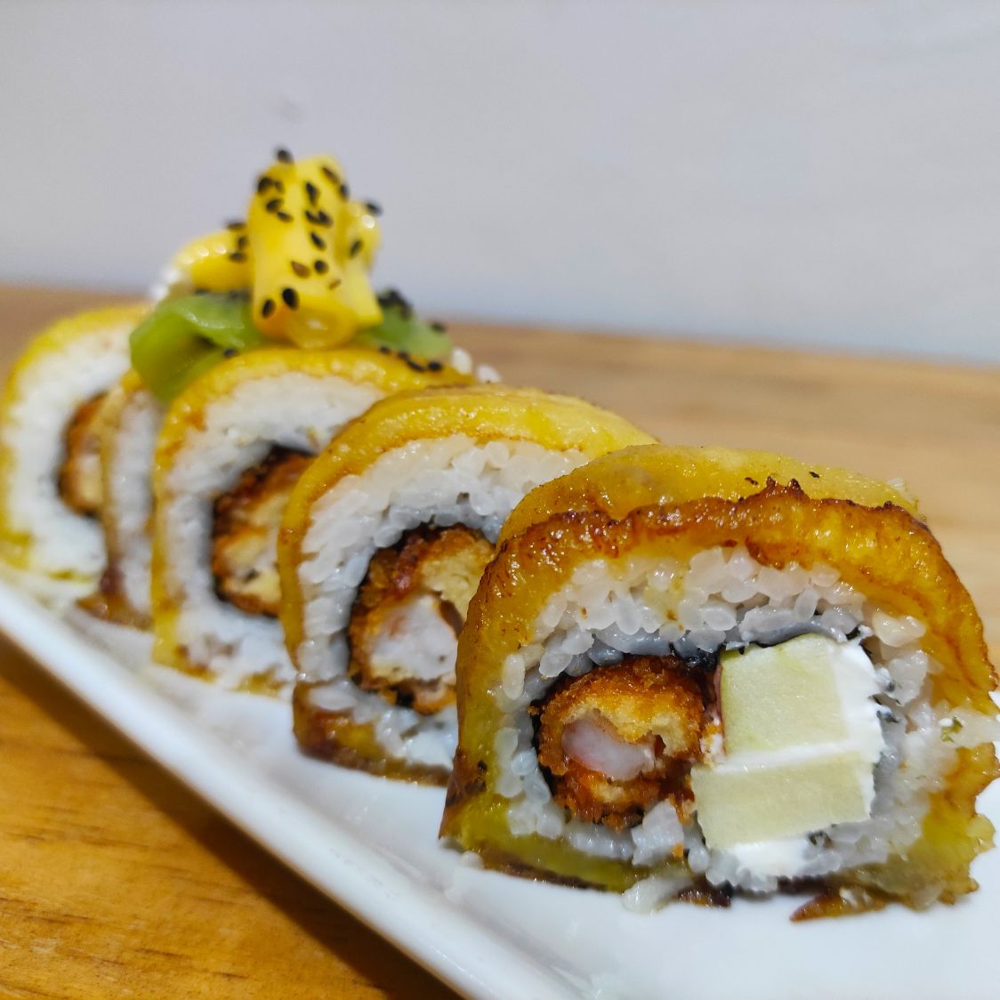 Por fuera plátano frito, ajonjolí blanco y salsa de anguila, por dentro camarón empanizado, queso crema y manzana.