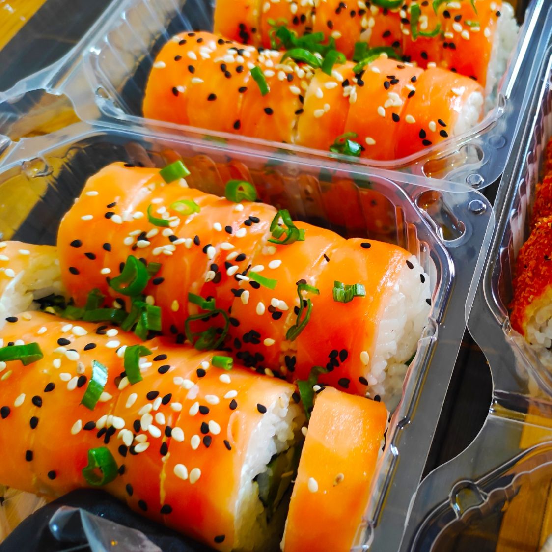 Por fuera salmón y ajonjolí blanco, por dentro queso crema, aguacate y pepino.