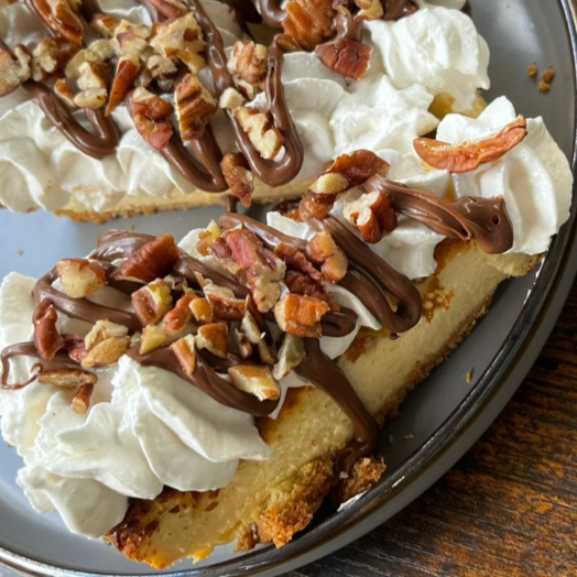 Delicioso pay de queso crema con cobertura de crema batida, nutella y nuez