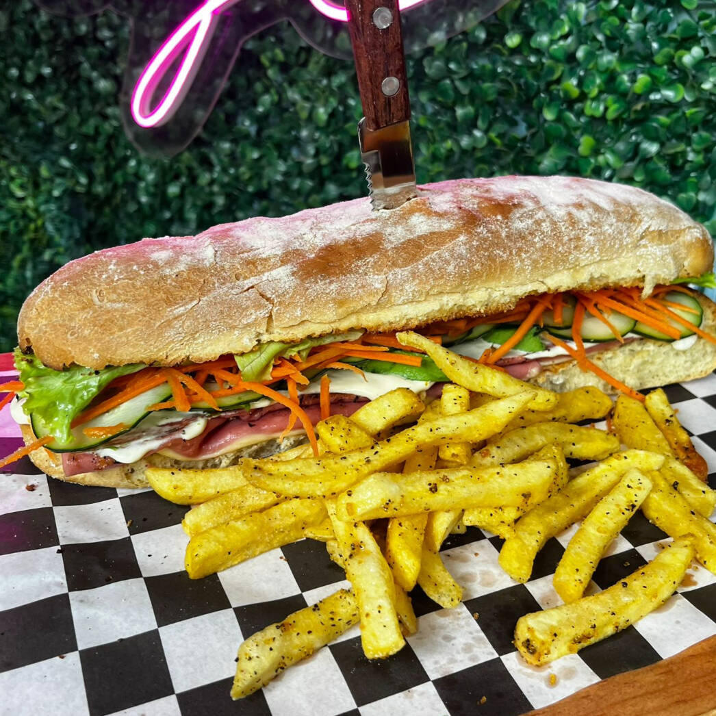 Pan artesanal, carne de res, jamón de pavo, queso americano, quesillo fundido, aderezo, lechuga y tomate.(No incluye papas)