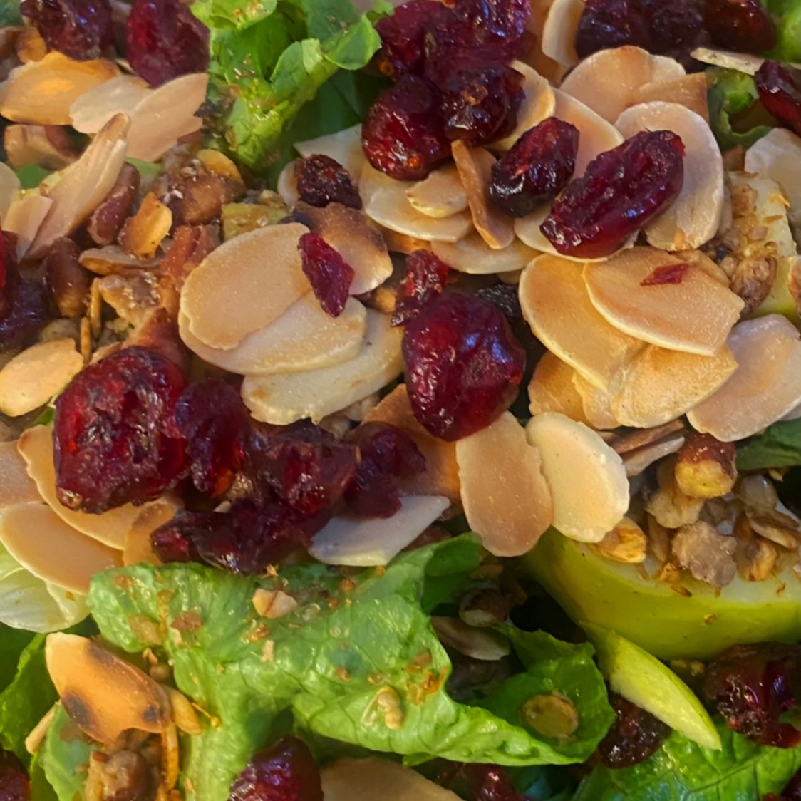 Lechuga, manzana, granola, avena,amaranto, nuez, arándanos , almendras y miel.