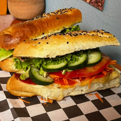 Pan artesanal con pepperoni y queso gouda con una cama de lechuga,tomate,aguactae y mayonesa