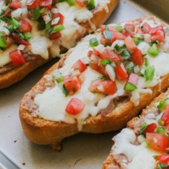 Tres piezas de molletes (pan de baguette artesanal);a base de pasta de frijol, quesos manchego y gouda, acompañados de pico de pico de gallo.