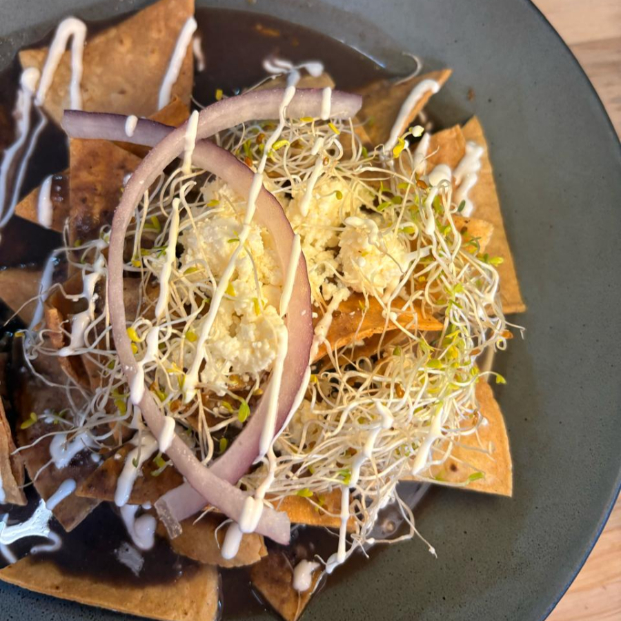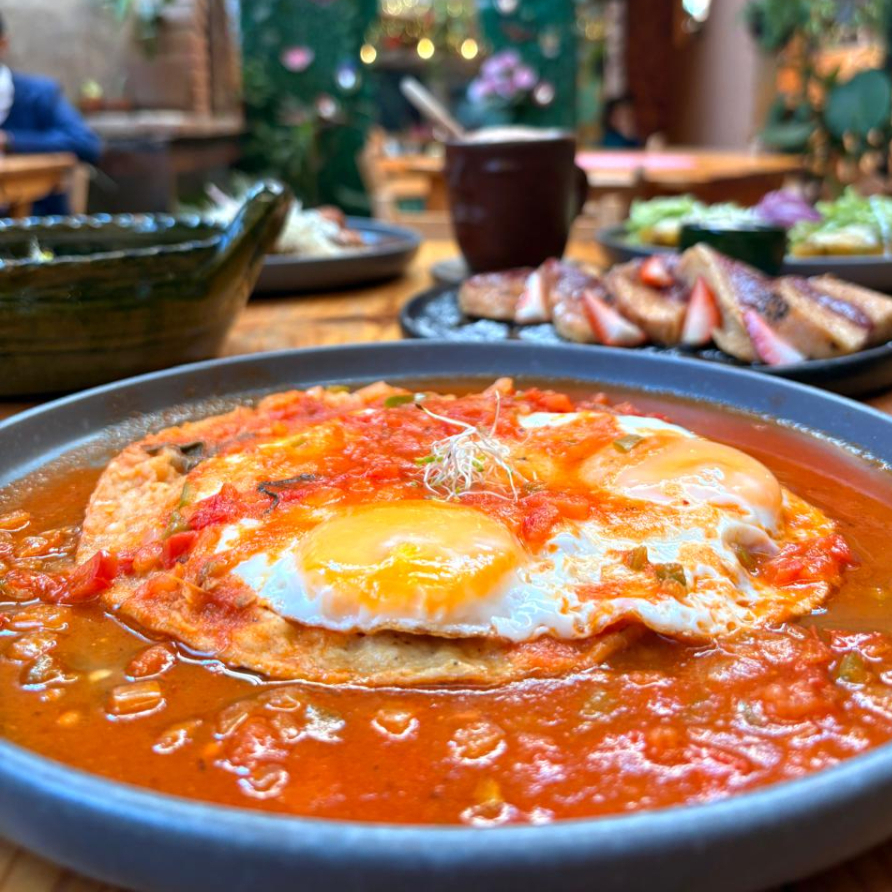 TORTILLA DE MAIZ FRITA, BAÑADA EN SALSA DE TOMATE Y CHILE MORITA, CON QUESO FRESCO, CEBOLLA, GERMEN DE TRIGO Y CREMA