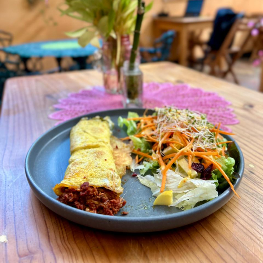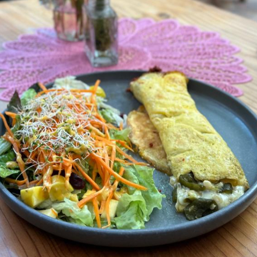 OMELLETTE CON GRANOS DE ELOTE Y CHILE POBLANO, ACOMPAÑADO DE ENSALADA Y FRIJOLES REFRITOS