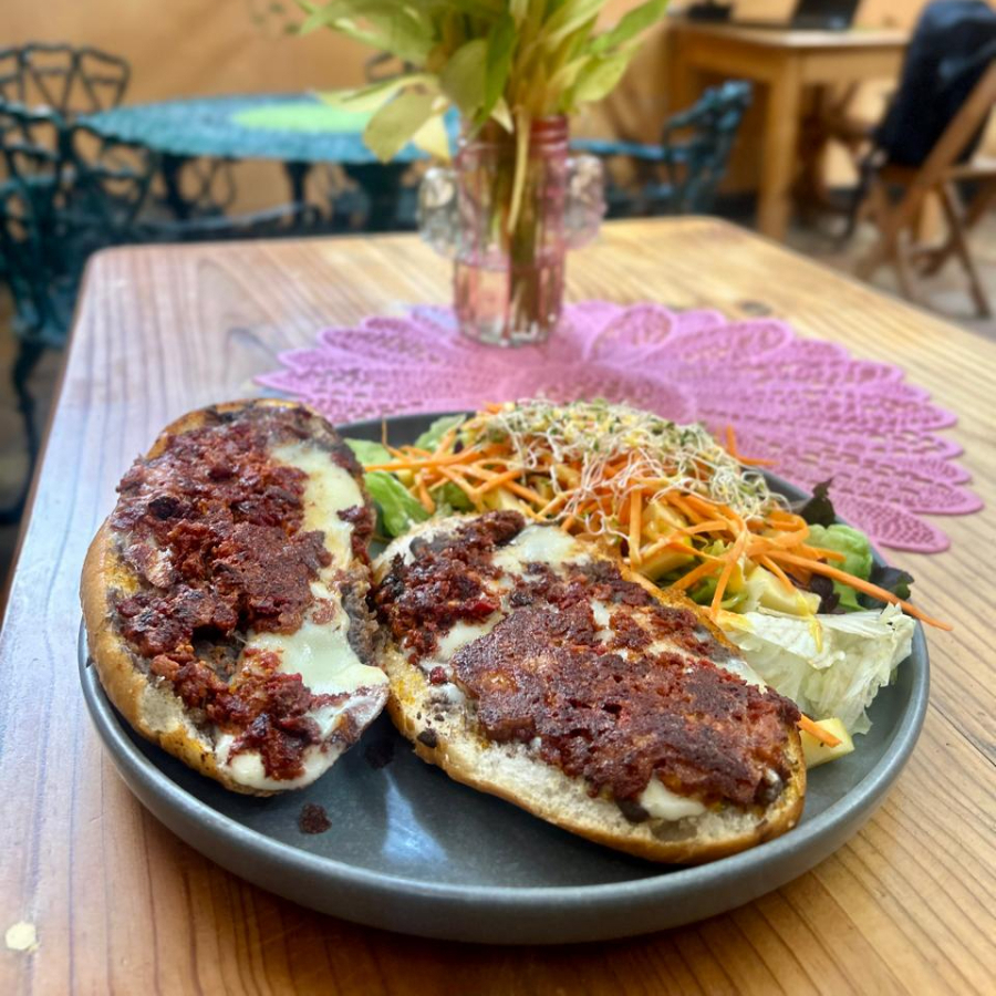 BOLILLO CON PASTA DE FRIJOL, QUESO MOZZARELLA Y TASAJO, ACOMPAÑADO CON ENSALADA