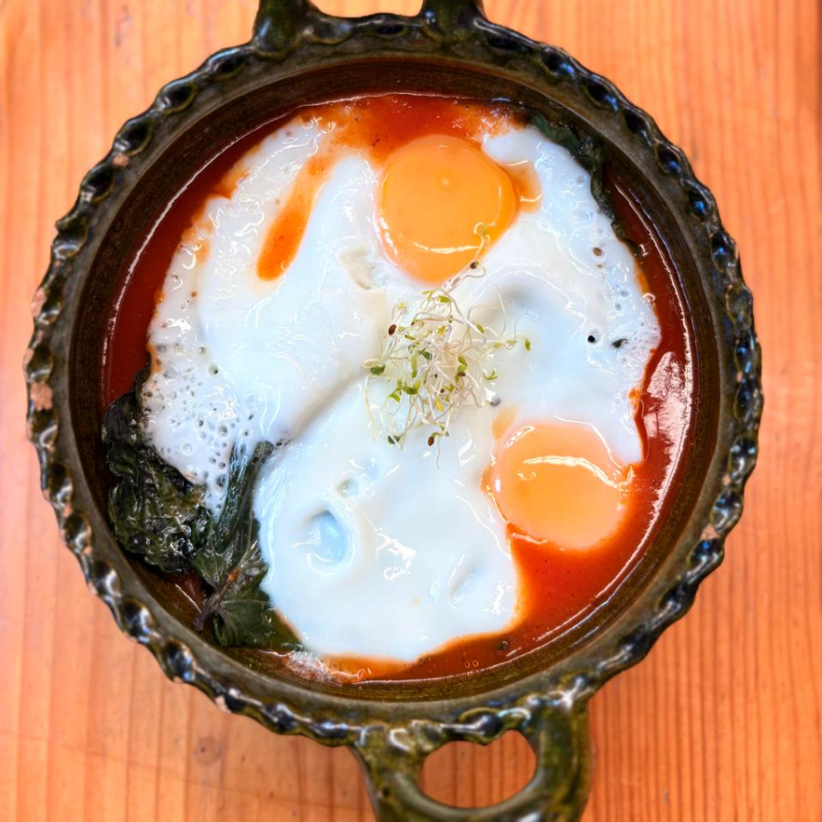 2 PIEZAS DE HUEVOS ESTRELLADOS COCIDOS SOBRE HOJA SANTA CON RAJAS DE CHILE POBLANO, ELOTE Y QUESO, EN SALSA DE CHILE MORITA.