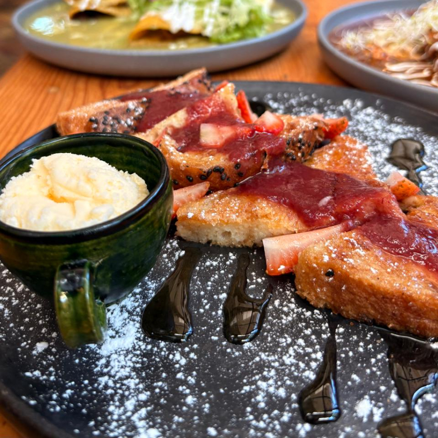 PAN DE MASA MADRE REMOJADO EN UNA MEZCLA SABOR A CANELA Y VAINILLA, CON FRESAS Y COMPOTA DE FRUTOS ROJOS