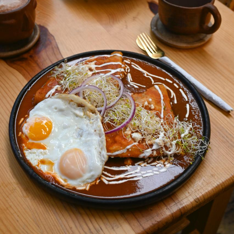 TORTILLA DE MAIZ FRITA, BAÑADA EN MOLE COLORADITO, CON QUESO FRESCO, CEBOLLA, GERMEN DE TRIGO Y CREMA