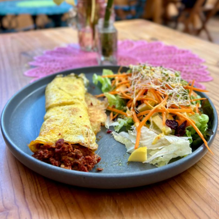 OMELLETTE RELLENO DE CHORIZO CON QUESO MOZZARELLA, ACOMPAÑADO CON ENSALADA Y FRIJOLES REFRITOS