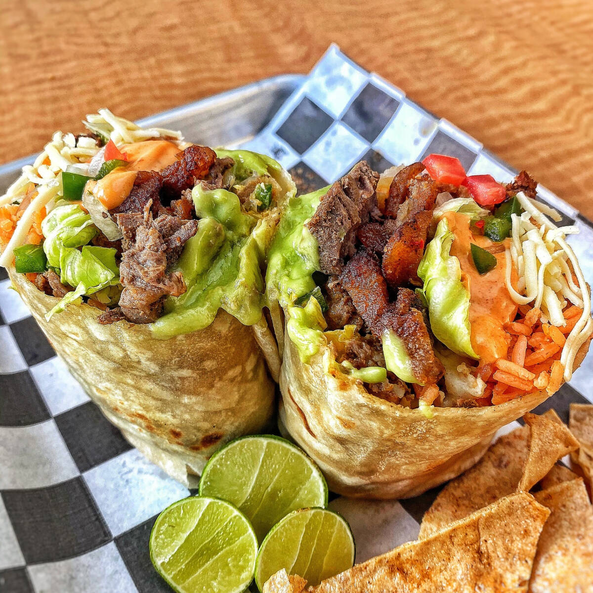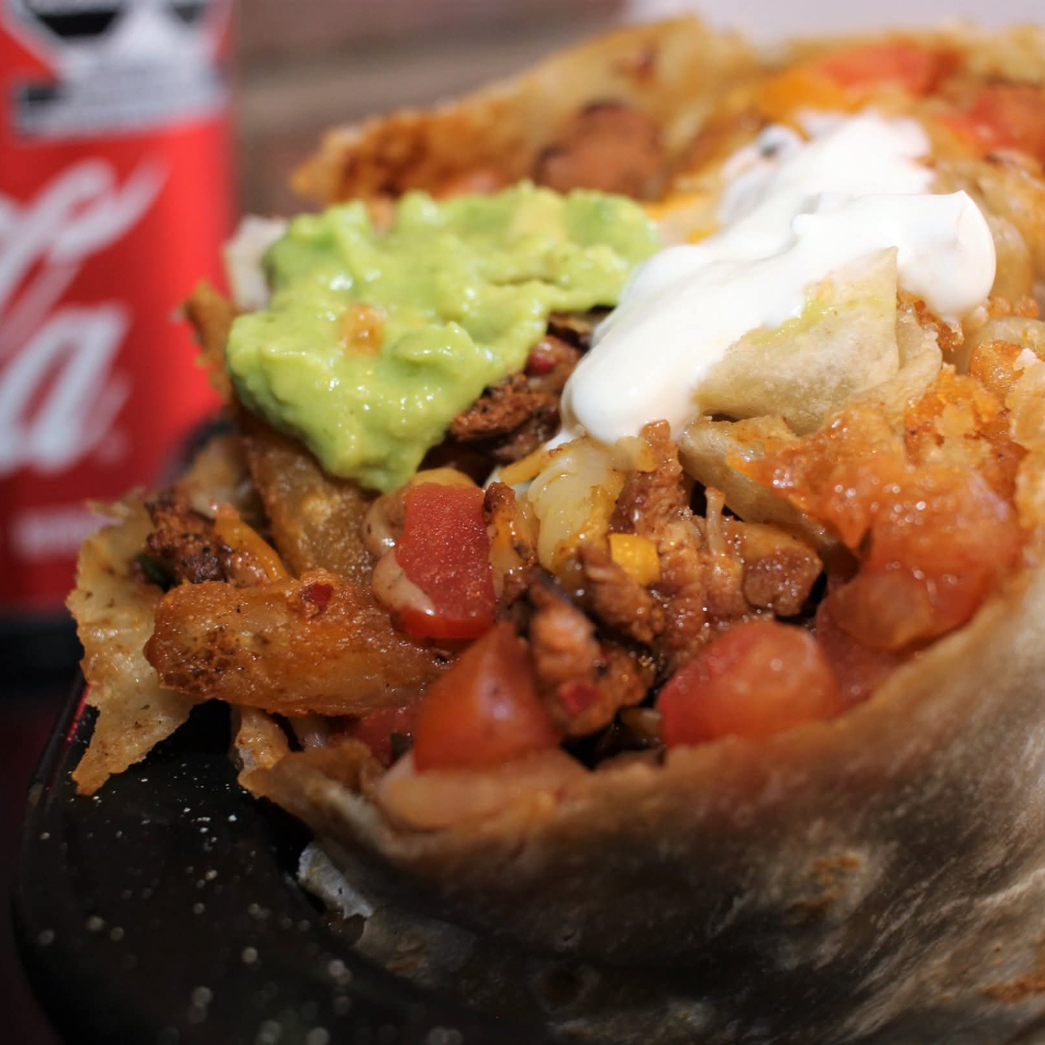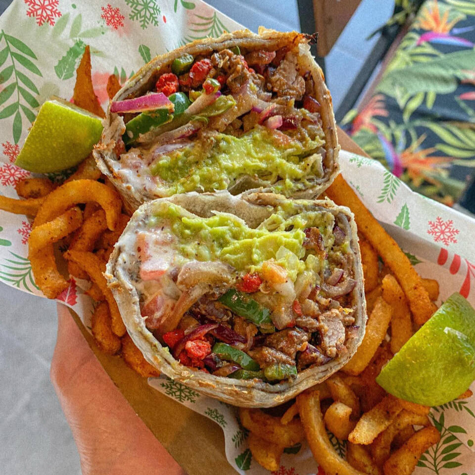 2TORTILLA DE HARINA XXL,COSTILLA ASADA, GUACAMOLE, LECHUGA, CREMA, ARROZ, PICO DE GALLO, ELIGE ALGÚN EXTRA... INCLUYE PORCION DE PAPAS A LA FRANCESA.