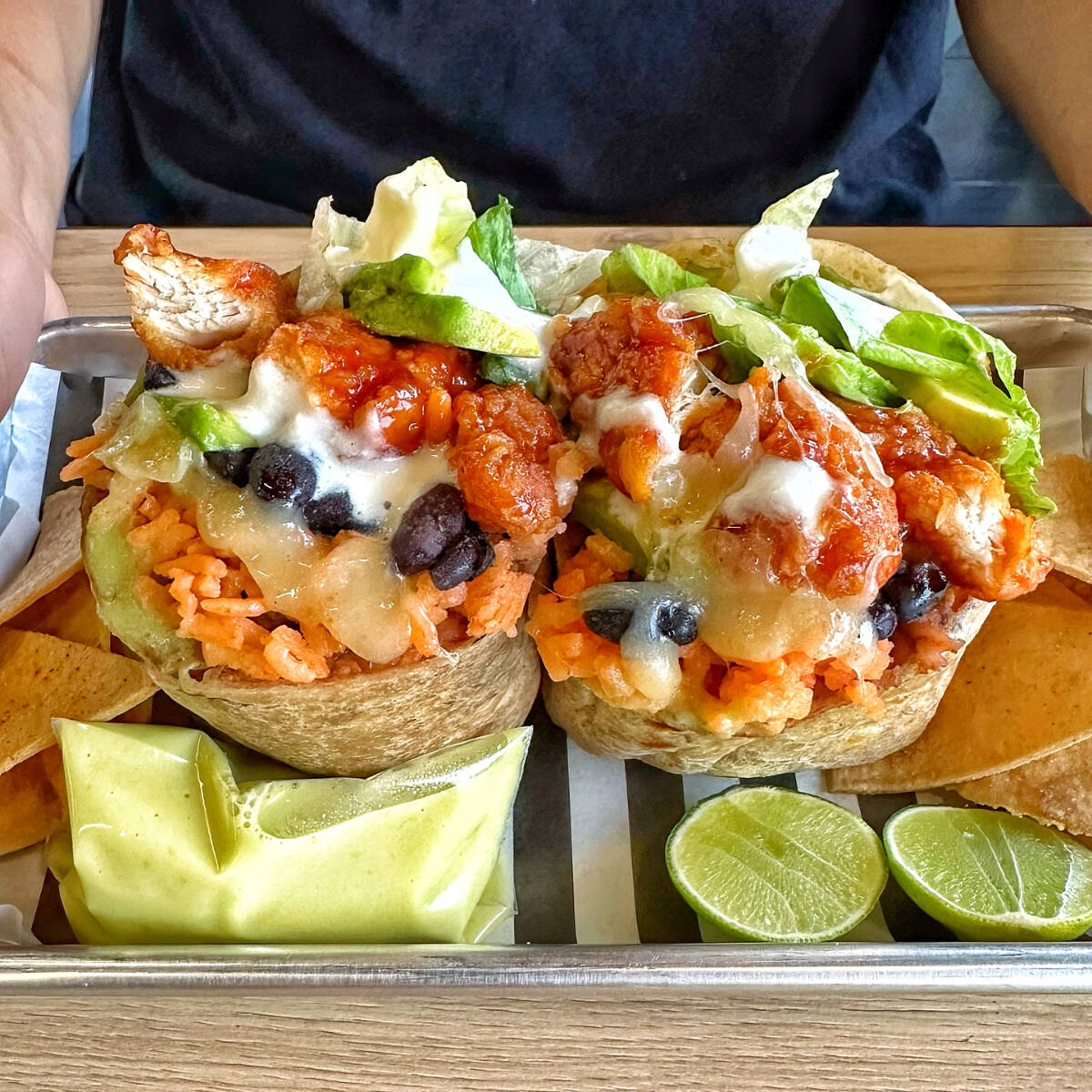 2TORTILLA DE HARINA XXL, BONELESS SON TROZOS DE PECHUGA DE POLLO SIN HUESO, MARINADOS, EMPANIZADOS Y FRITOS PARA LOGRAR UNA TEXTURA CRUJIENTE POR FUERA Y JUGOSA POR DENTRO.LECHUGA, CREMA,FRIJOLES REFRITOS, ELIGE ALGÚN EXTRA...INCLUYE PORCION DE PAPAS A LA FRANCESA.