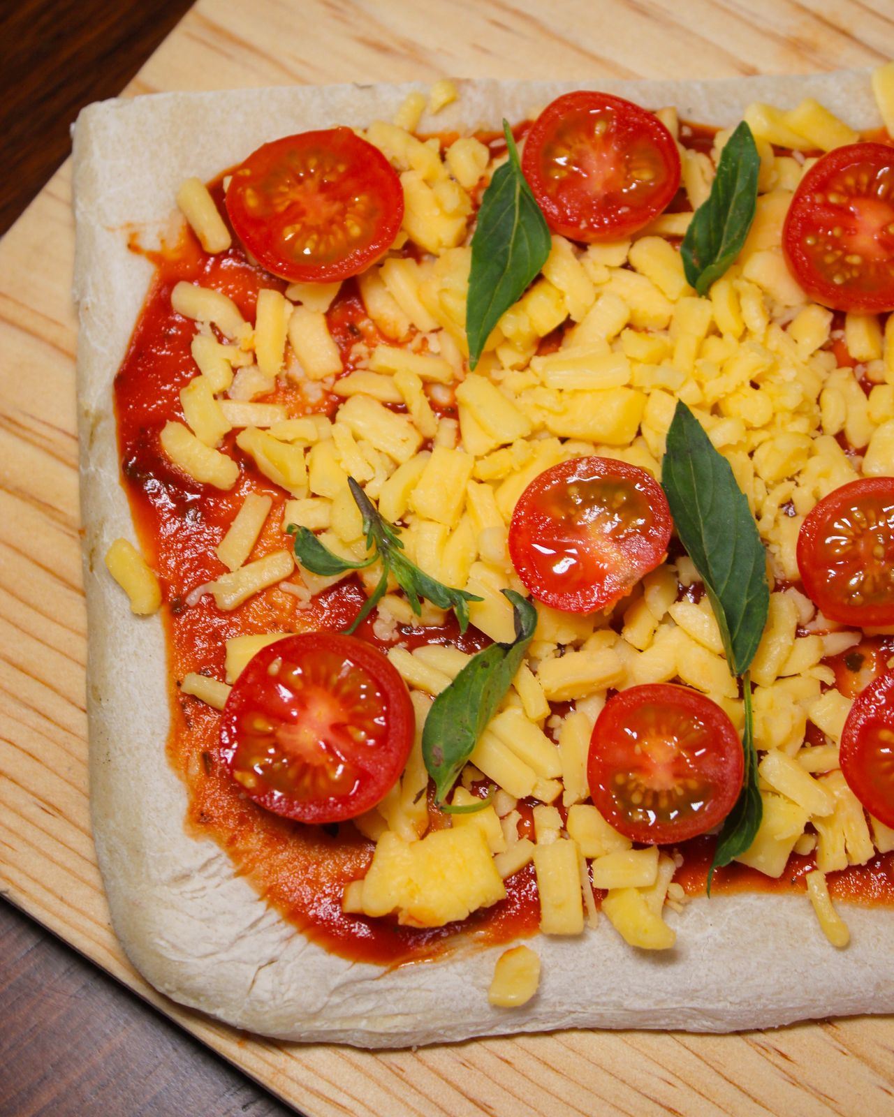 Rebanada de 15x20 cm, mozzarella, manchego, tomate cherry y albahaca.