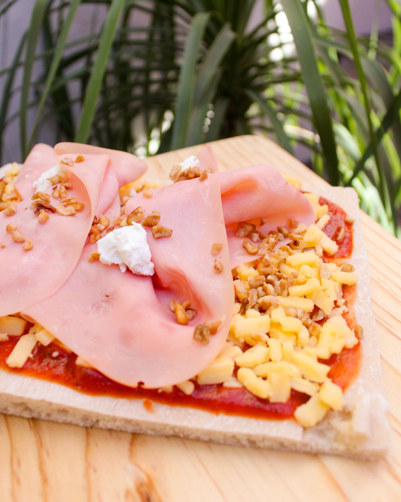 Rebanada de 15x20 cm, manchego, jamón, queso cabra y nuez.