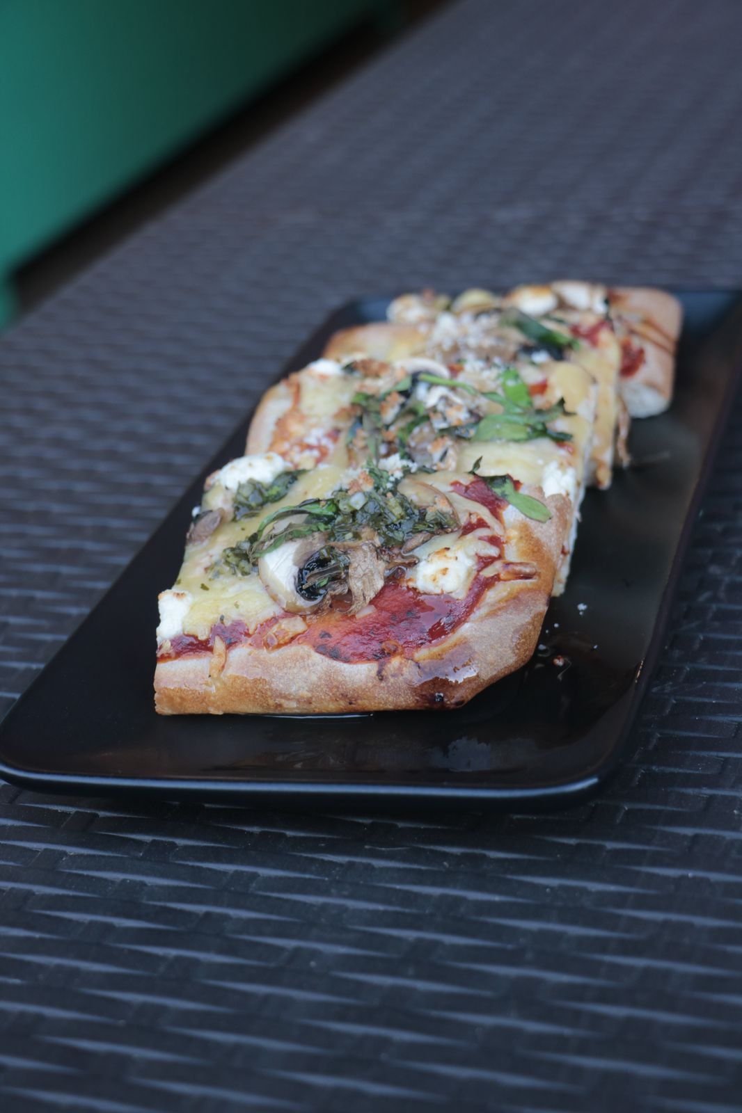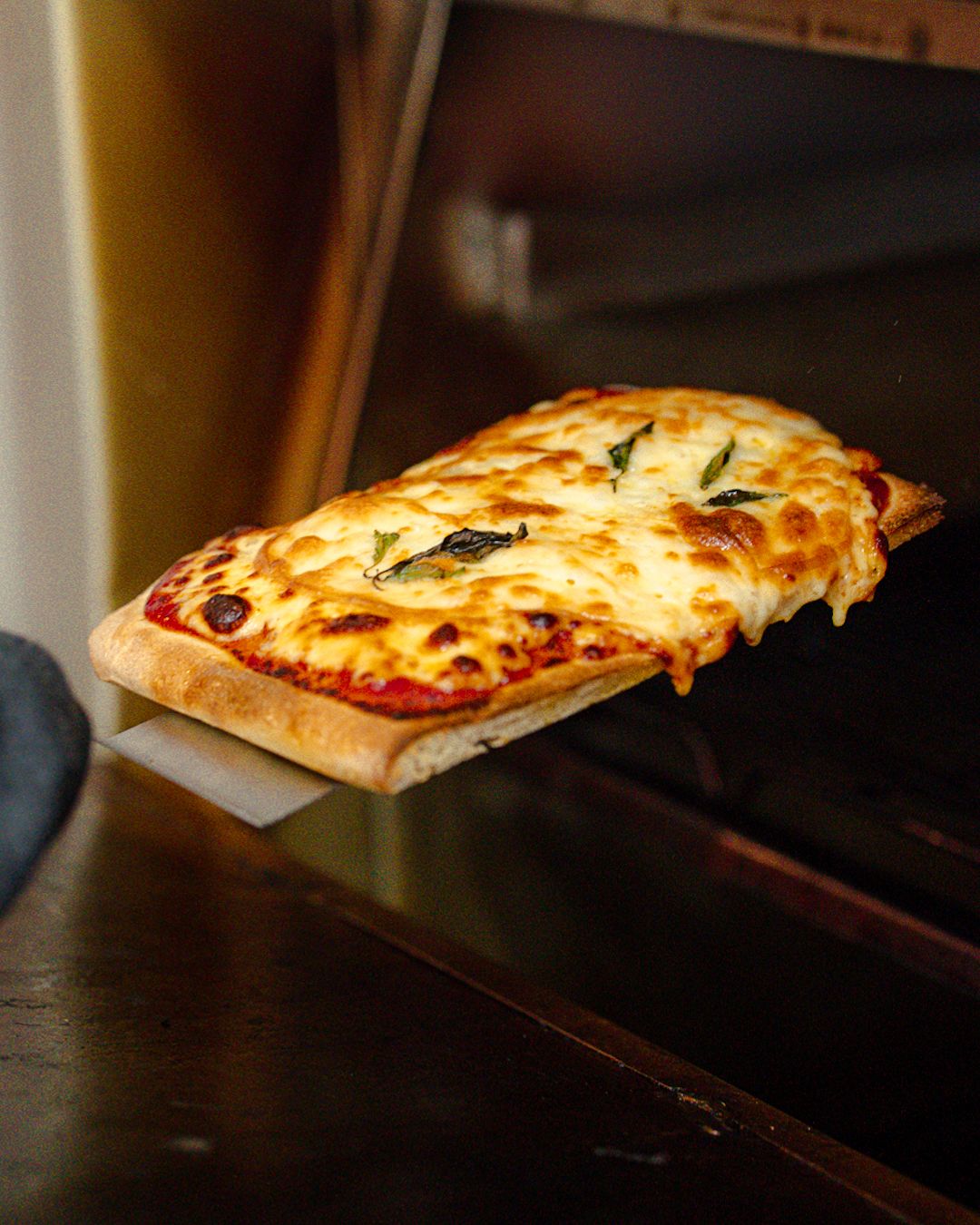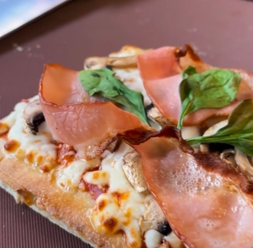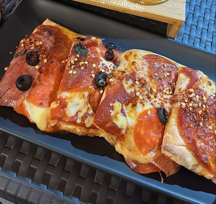 Rebanada de 15x20 cm, manchego, mozarela, pepperoni, jamón serrano, aceitunas negras y albahaca.