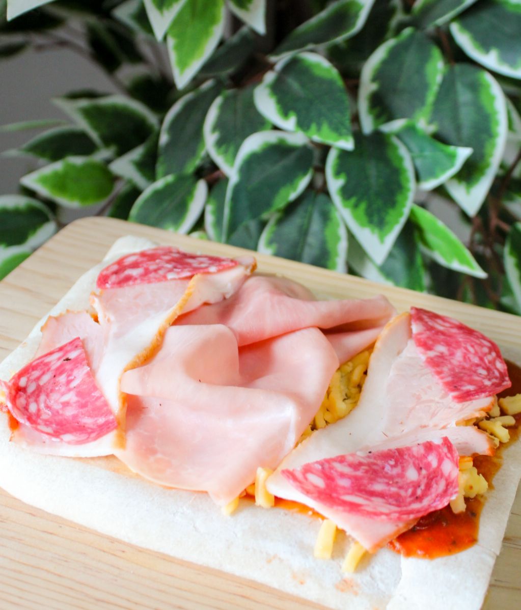 Rebanada de 15x20 cm, manchego, mozzarella y salami.