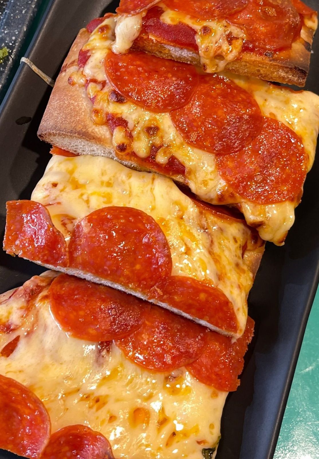 Rebanada de 15x20 cm, manchego, mozarela, pepperoni y albahaca.