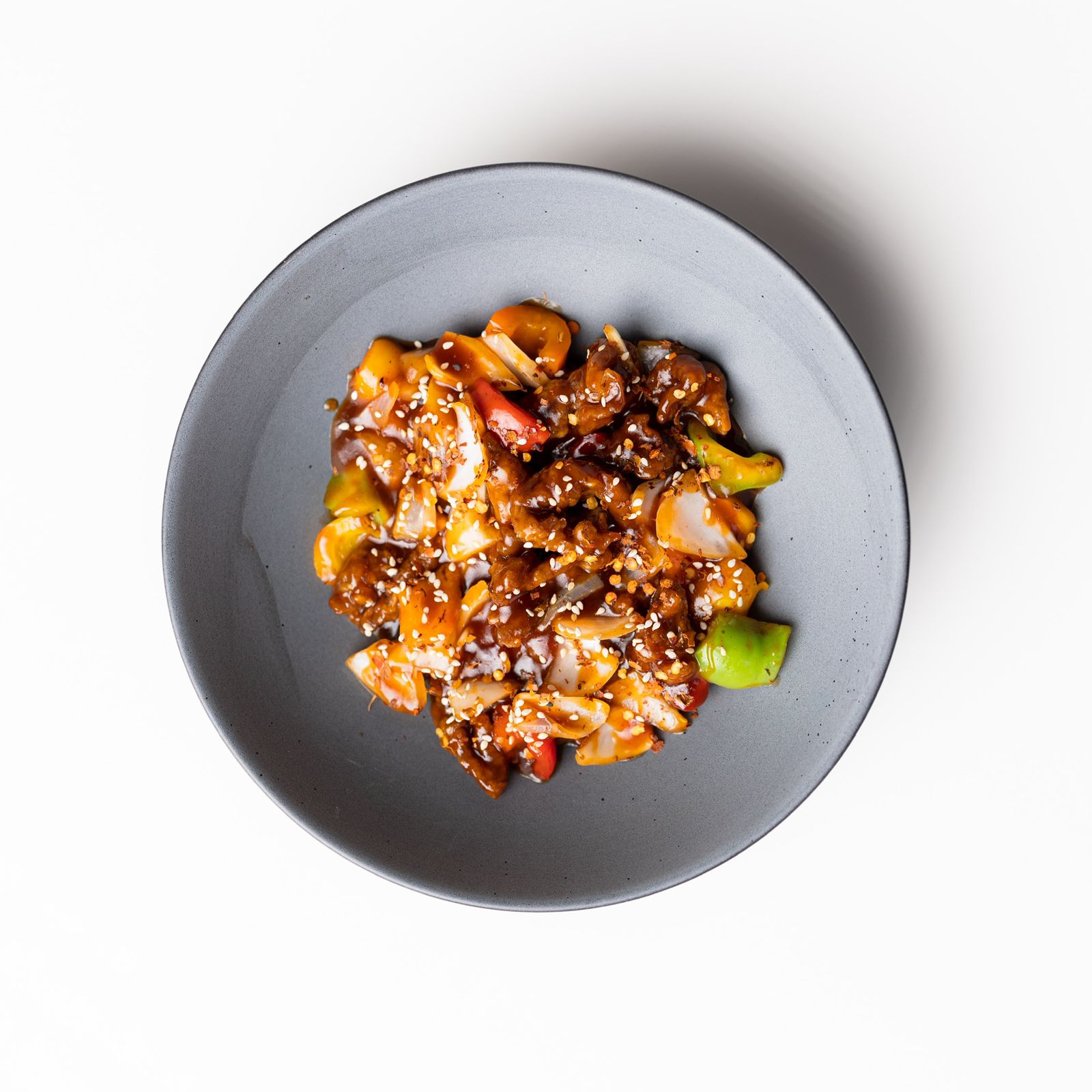 Laminas de carne de res frita con pimiento y cebollas al wok, con salsa agridulce y picante.