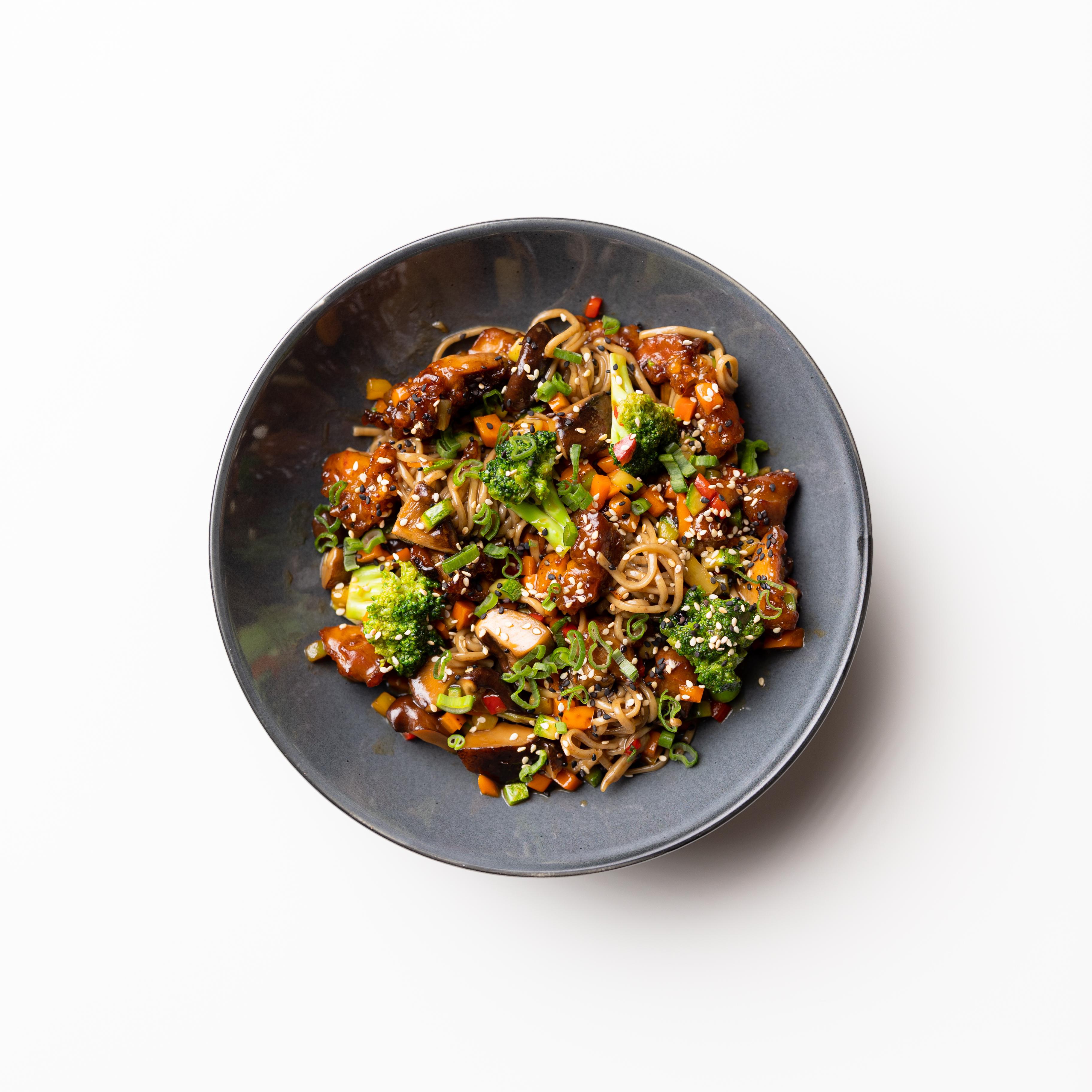 Fideos de trigo al wok con salsa de ostión, pollo frito y mezcla de verduras.