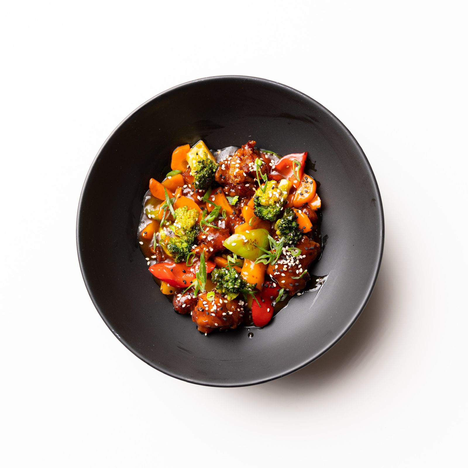 Pollo frito con mezcla de pimientos y zanahoria al wok con salsa agridulce de tomate.