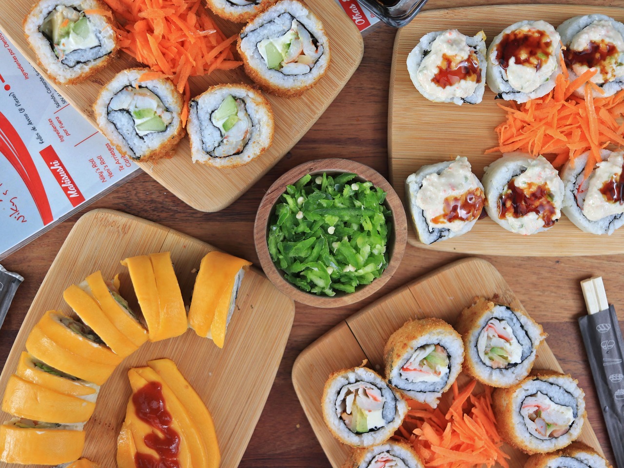 , camarón, surimi, Philadelphia, queso manchego y aguacate. Con guarnición de zanahoria.