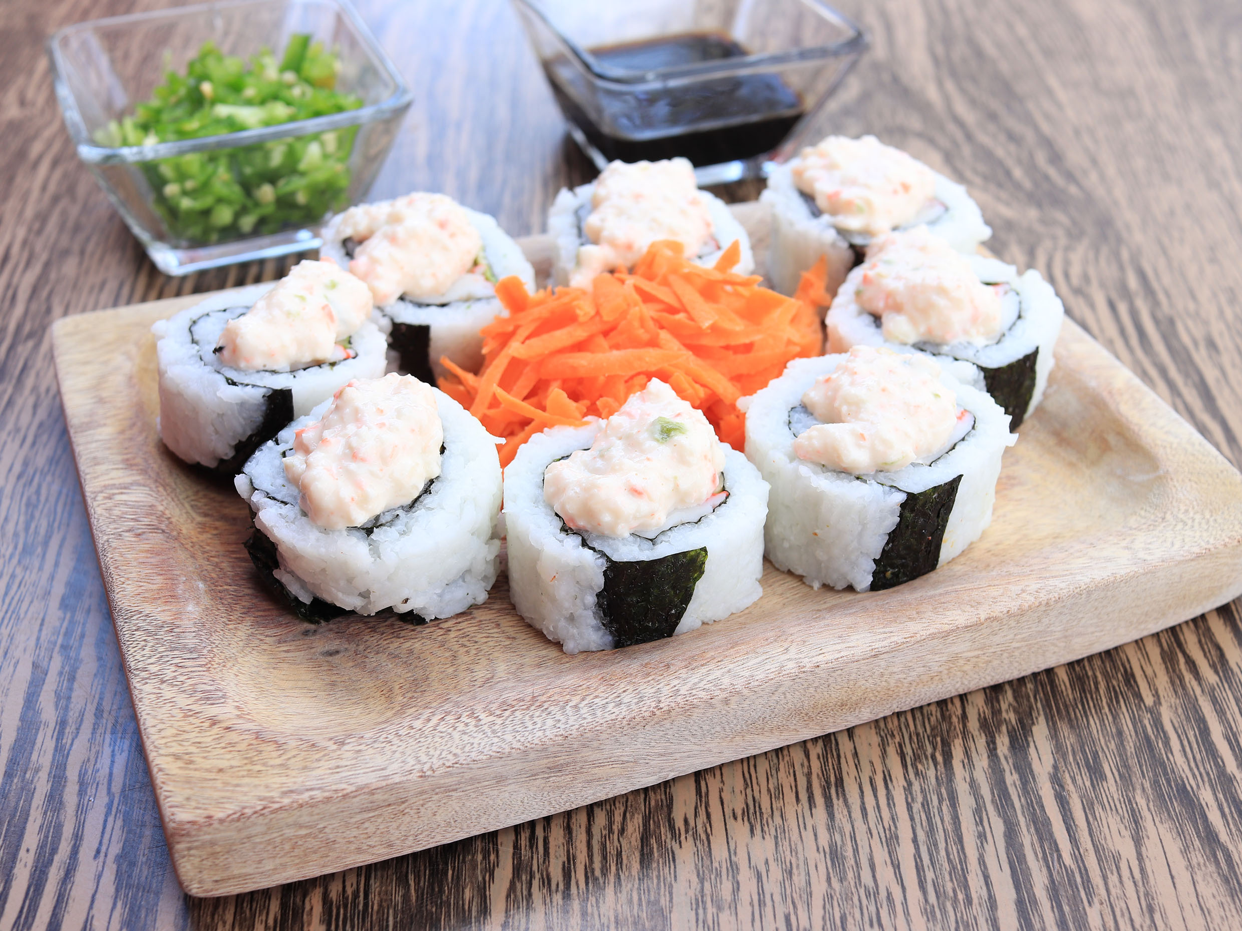 Philadelphia, camarón, aguacate y salsa dinamita por fuera. Con guarnición de zanahoria.