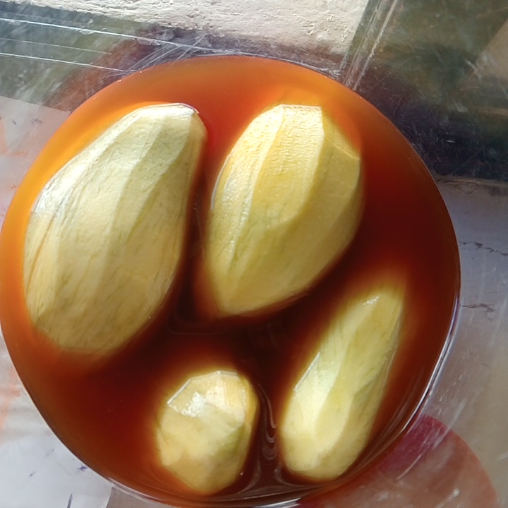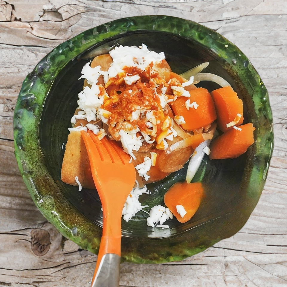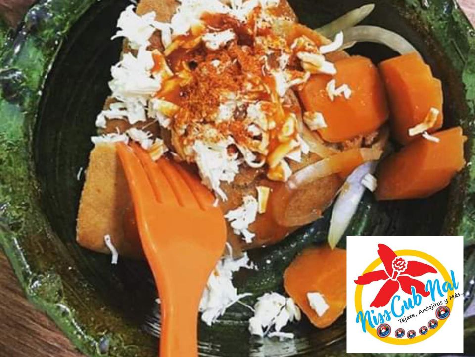 Pan horneado acompañado de papa, zanahorias, y cebolla curtidos en vinagre.