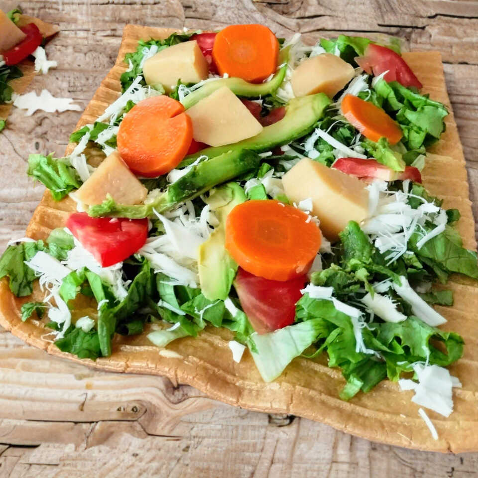 Cebolla, papas y zanahoria curtida, salsa, lechuga, quesillo,