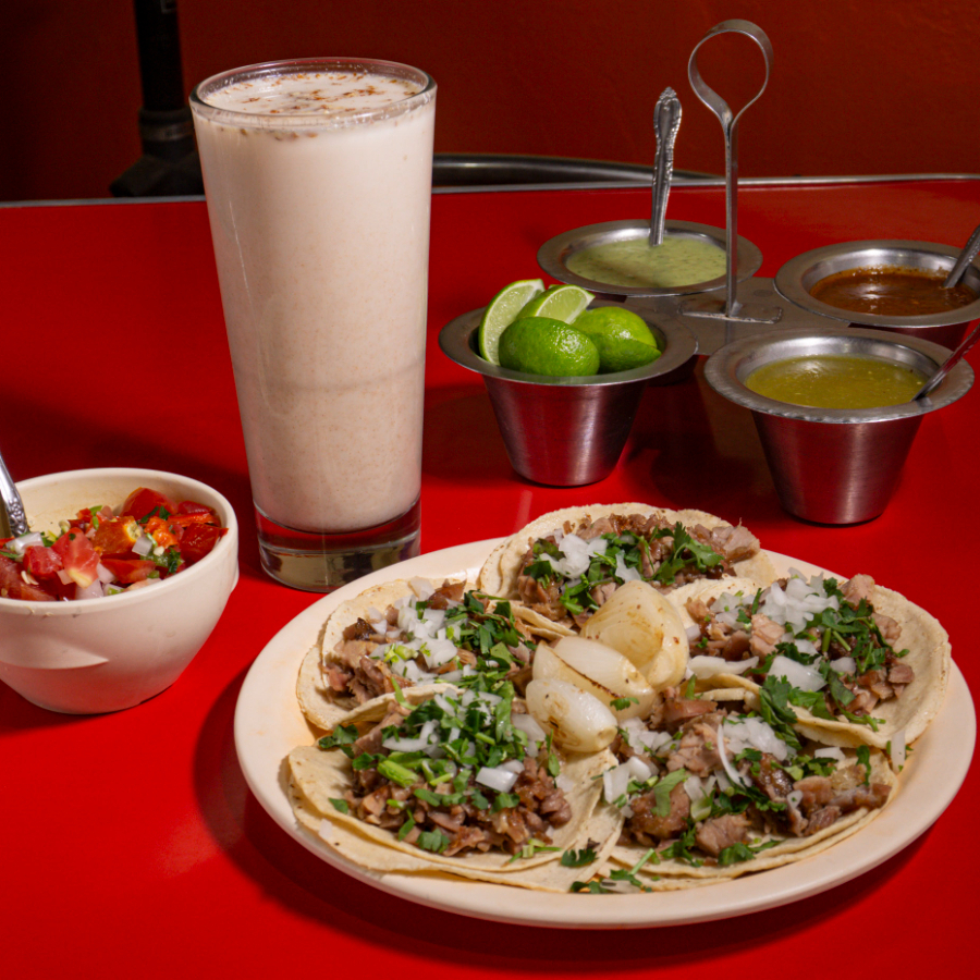 5 tacos al pastor+ 1 agua de Horchata