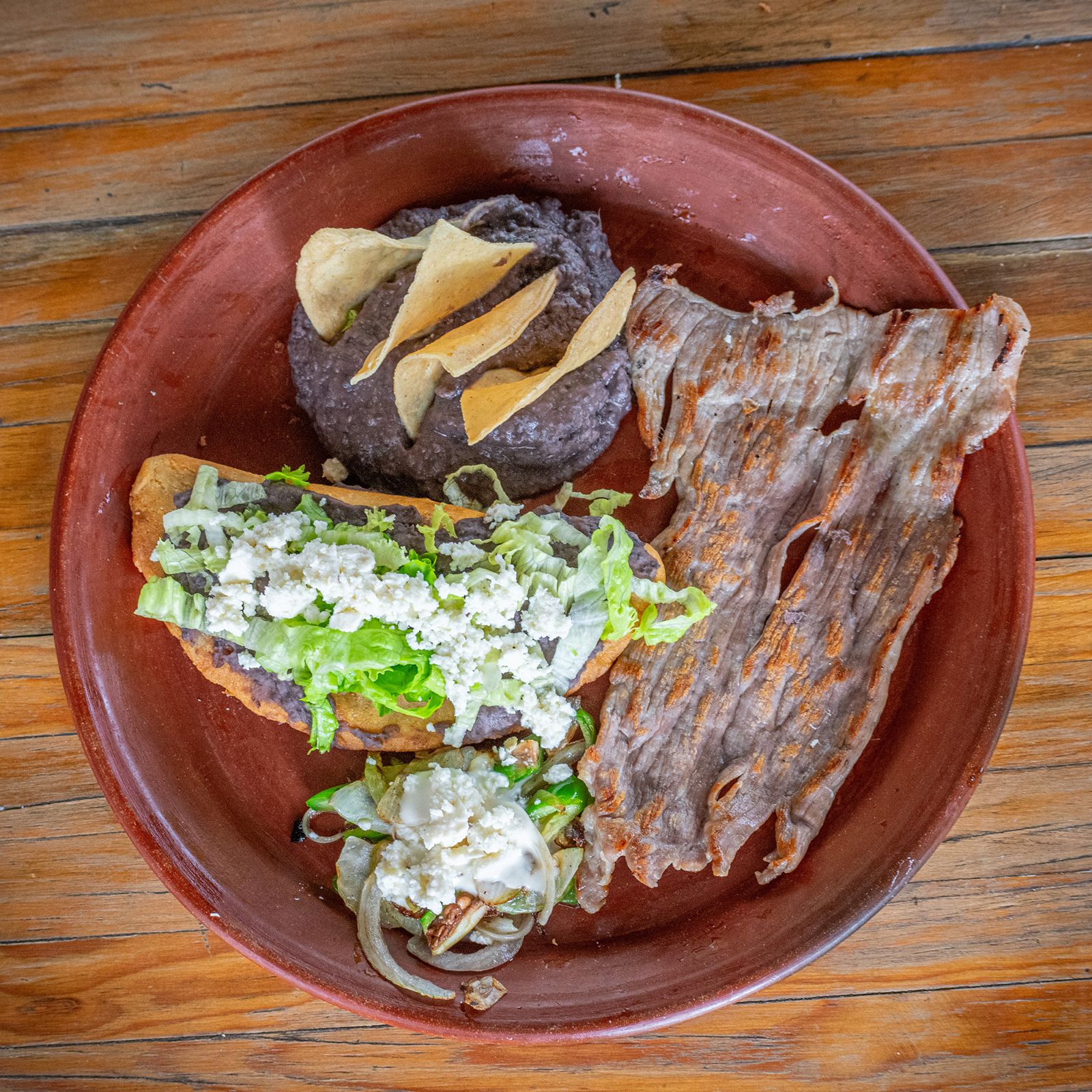 Acompañado de rajas de queso, frijoles refritos y quesadilla de epazote.